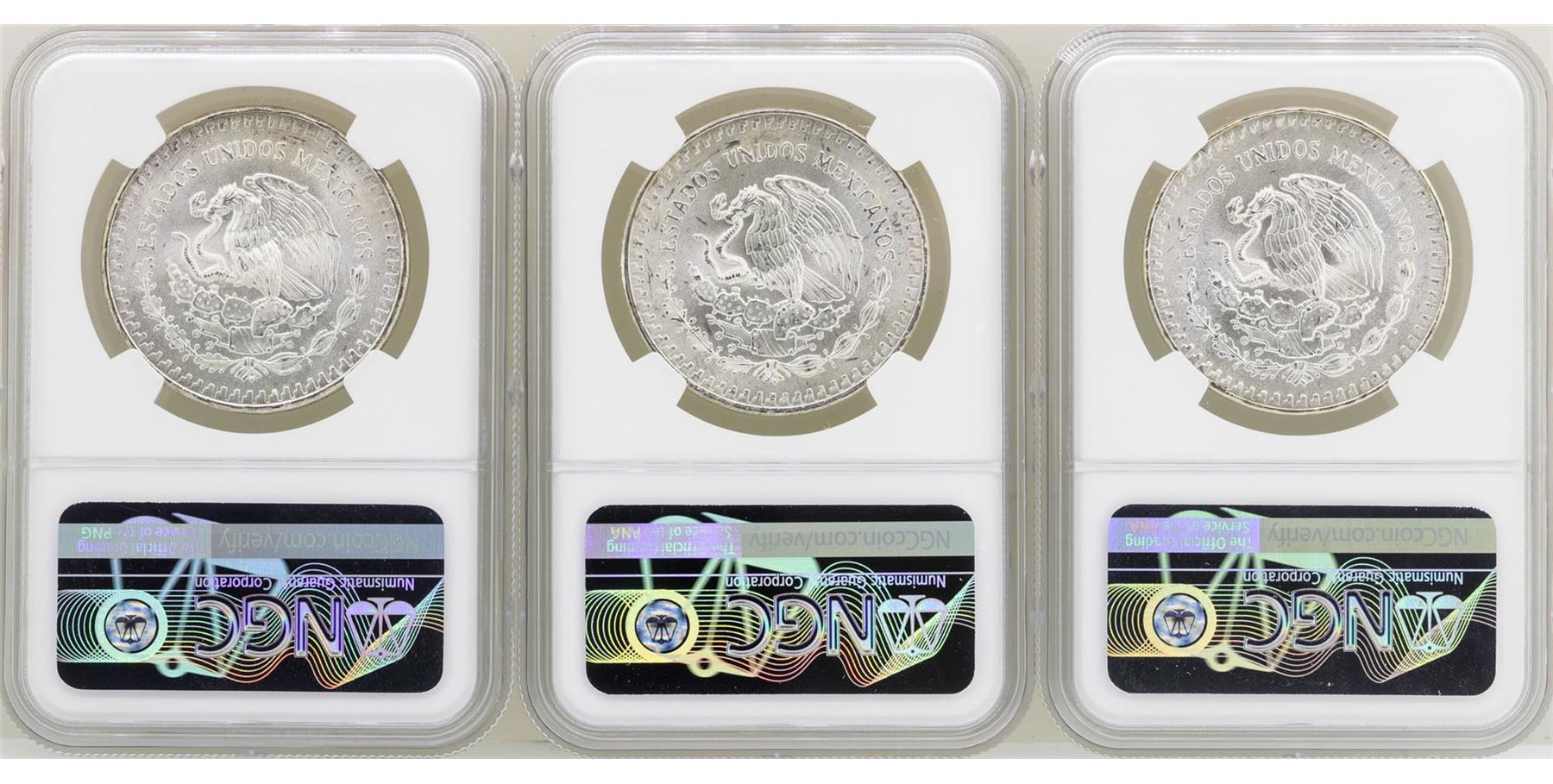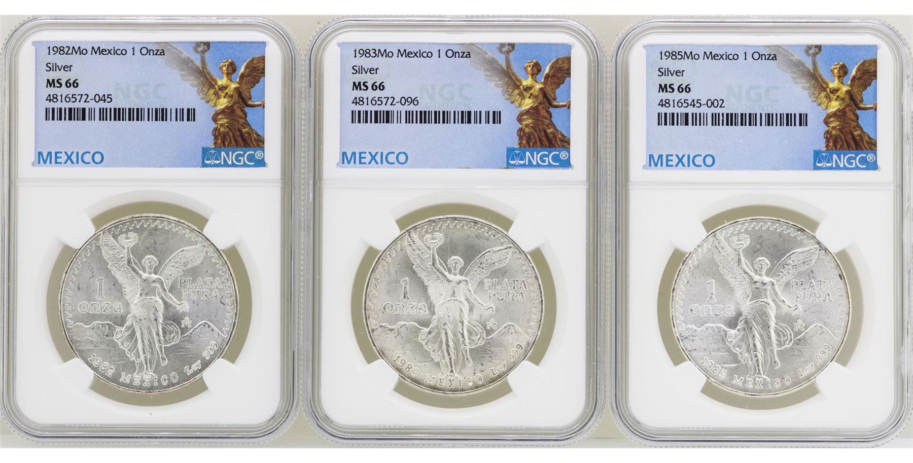 One Lot of 1982Mo/1983Mo/1985Mo Mexico Libertad Onza Silver Coins NGC MS66. NGC Certified.