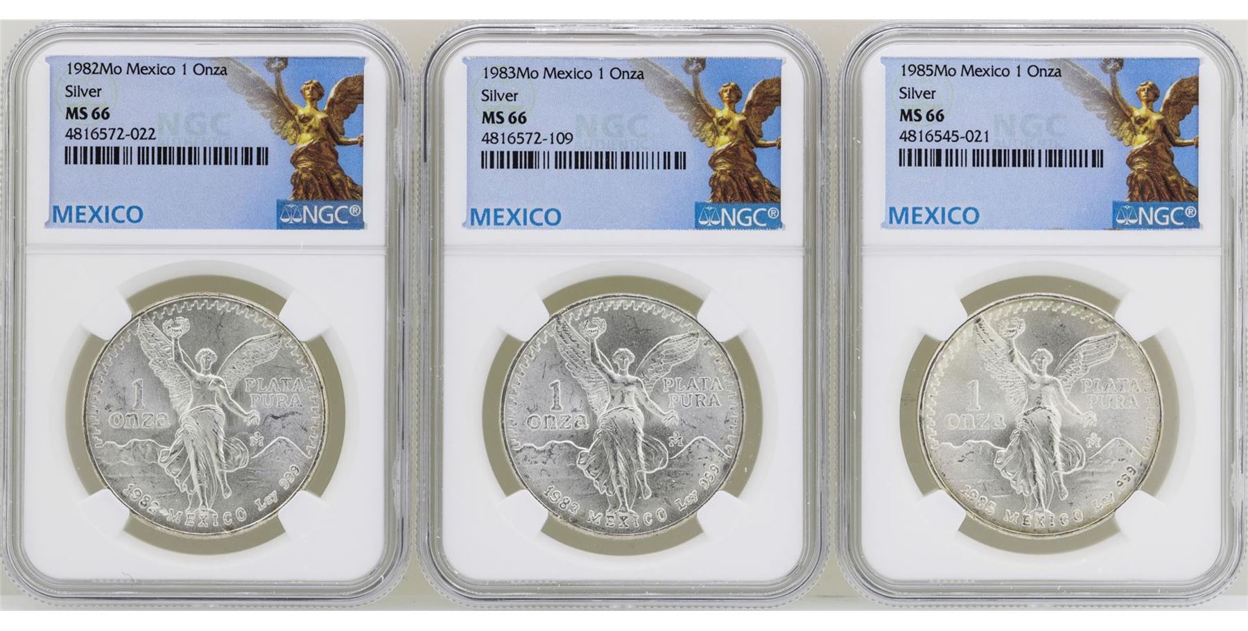 One Lot of 1982Mo/1983Mo/1985Mo Mexico Libertad Onza Silver Coins NGC MS66. NGC Certified.