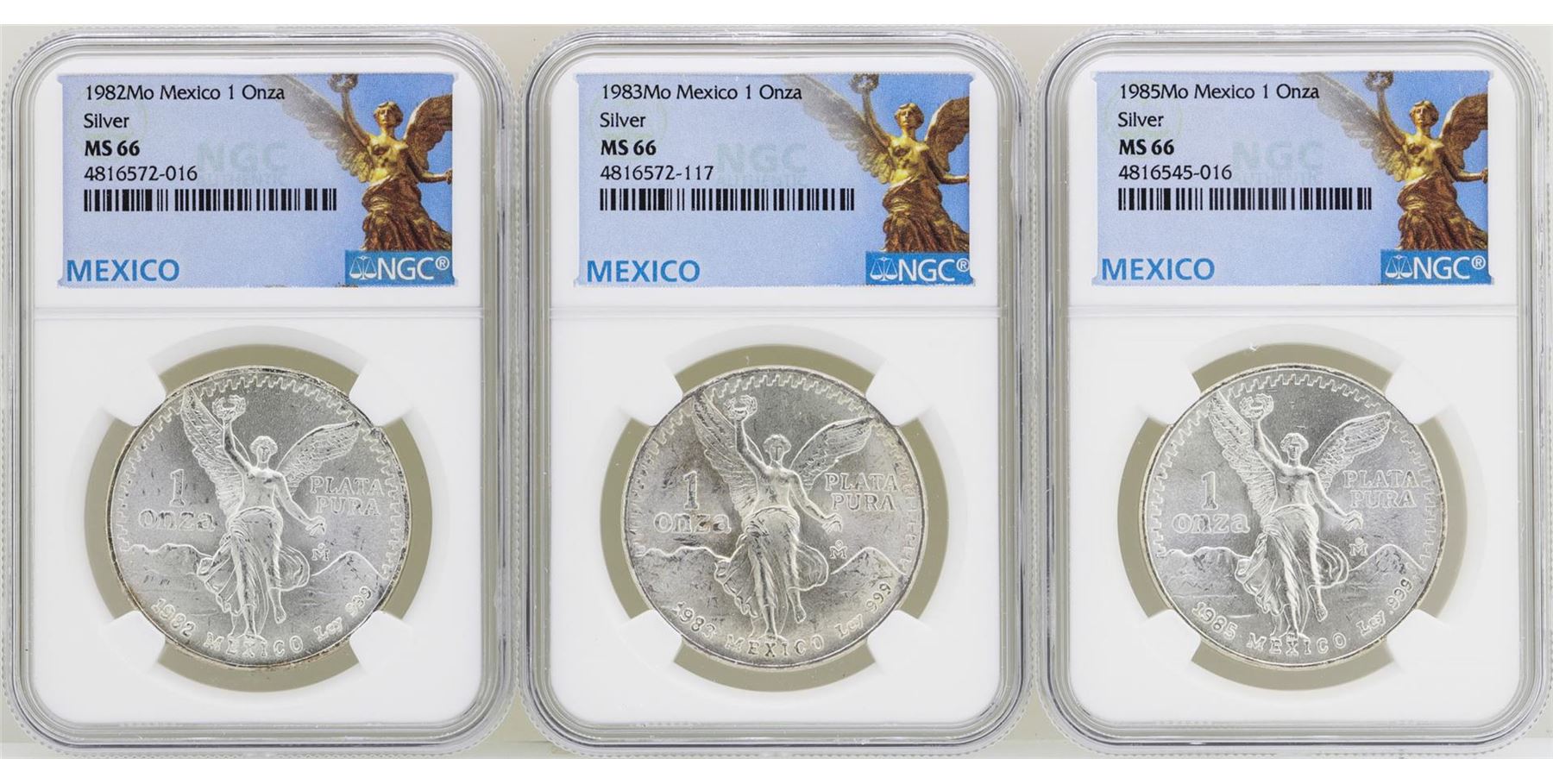 One Lot of 1982Mo/1983Mo/1985Mo Mexico Libertad Onza Silver Coins NGC MS66. NGC Certified.