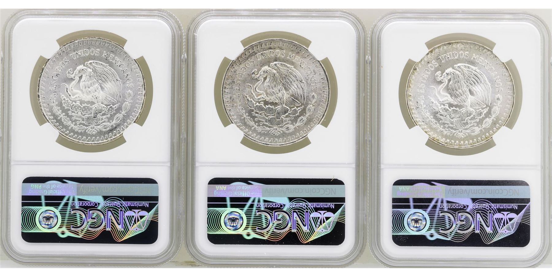 One Lot of 1982Mo/1983Mo/1985Mo Mexico Libertad Onza Silver Coins NGC MS66. NGC Certified.