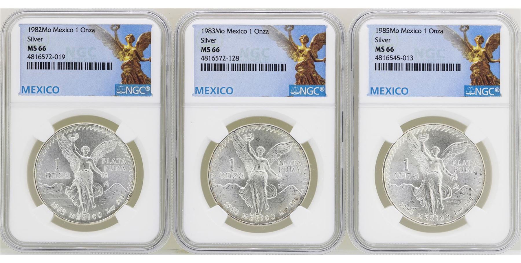 One Lot of 1982Mo/1983Mo/1985Mo Mexico Libertad Onza Silver Coins NGC MS66. NGC Certified.
