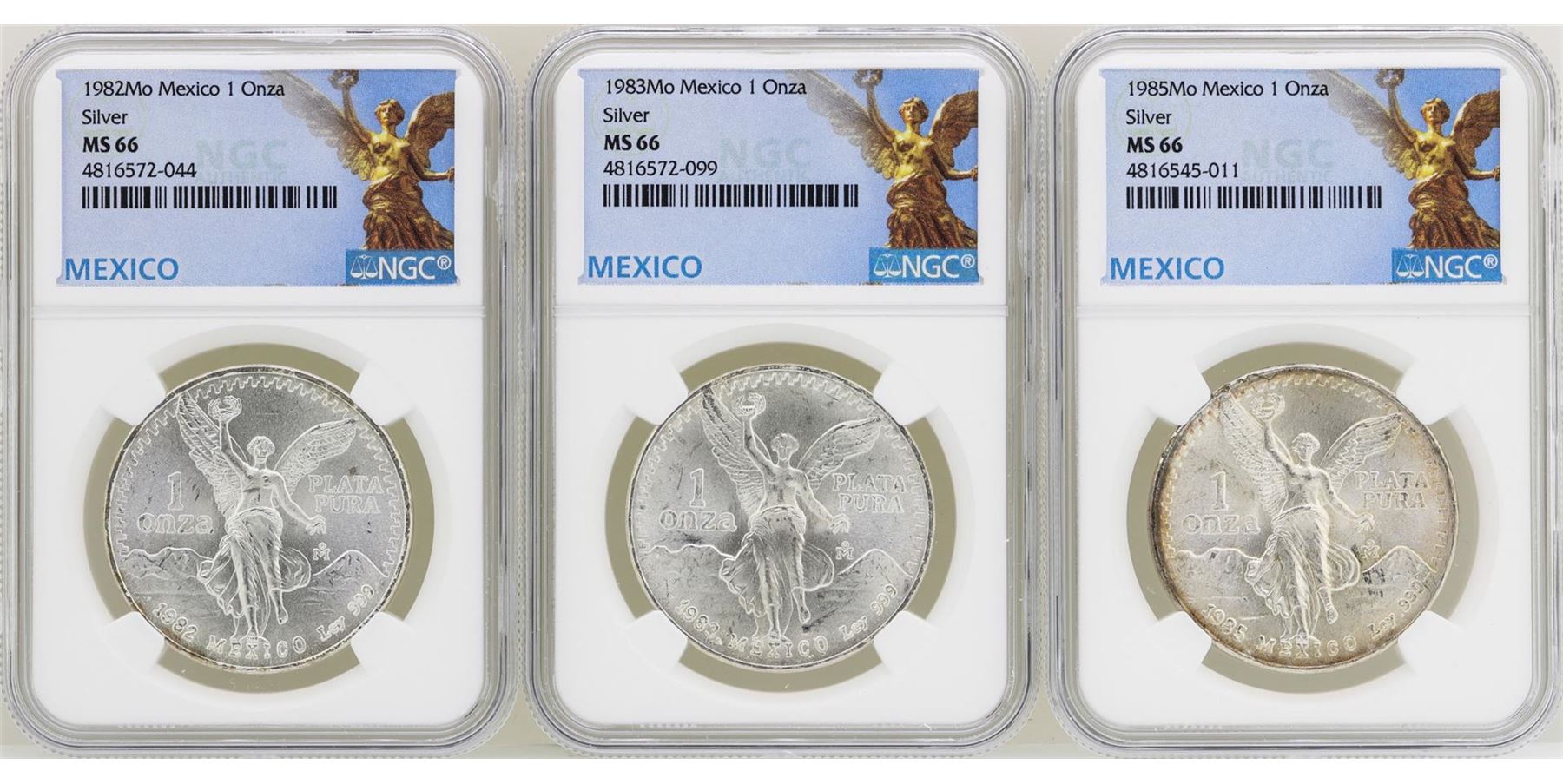 One Lot of 1982Mo/1983Mo/1985Mo Mexico Libertad Onza Silver Coins NGC MS66. NGC Certified.