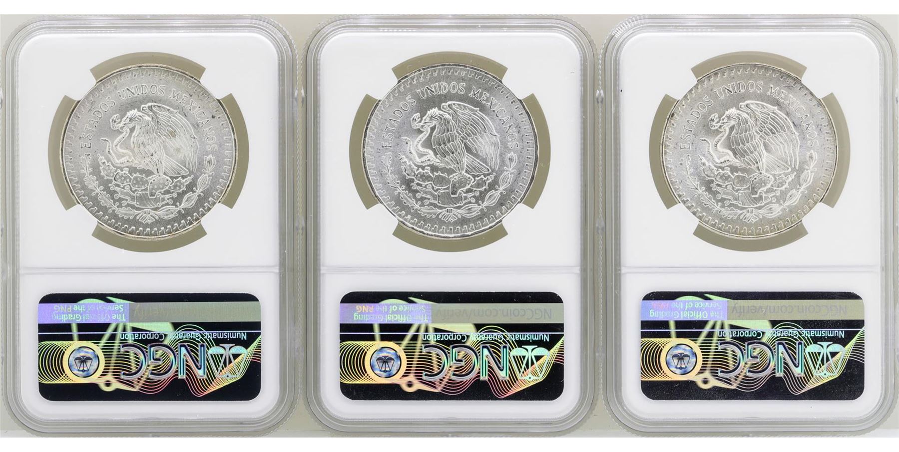 One Lot of 1982Mo/1983Mo/1985Mo Mexico Libertad Onza Silver Coins NGC MS66. NGC Certified.