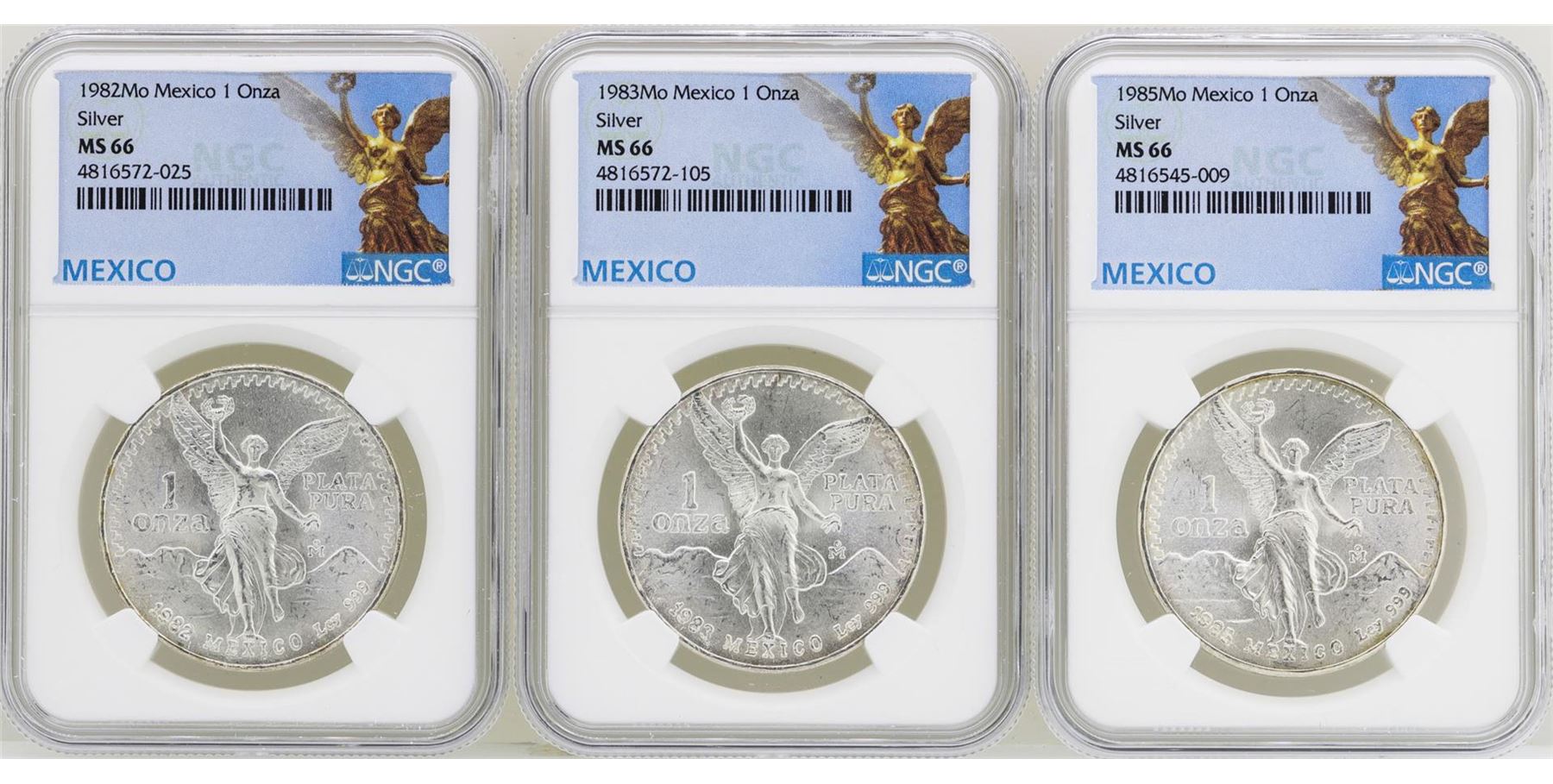 One Lot of 1982Mo/1983Mo/1985Mo Mexico Libertad Onza Silver Coins NGC MS66. NGC Certified.