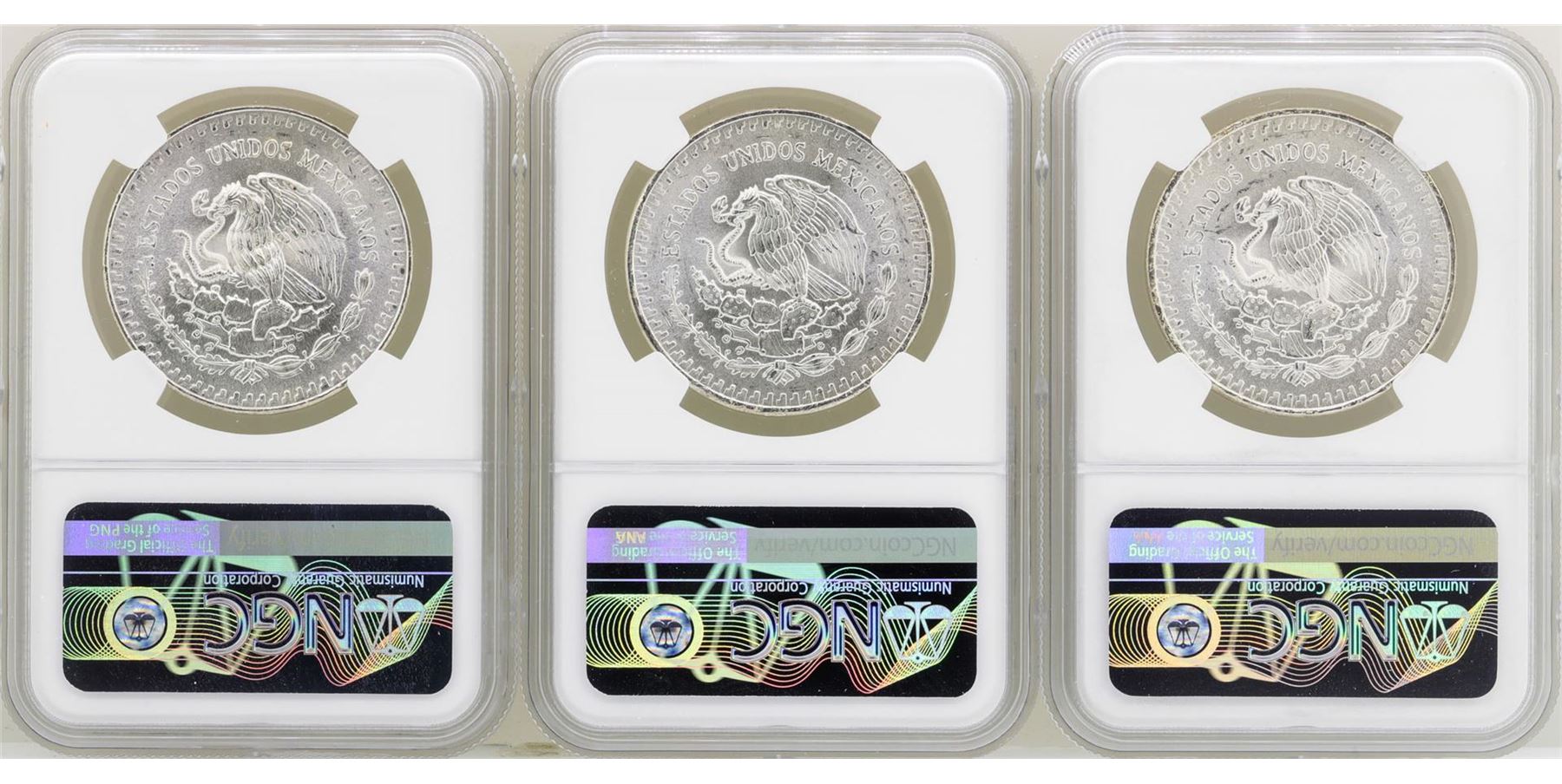 One Lot of 1982Mo/1983Mo/1985Mo Mexico Libertad Onza Silver Coins NGC MS66. NGC Certified.