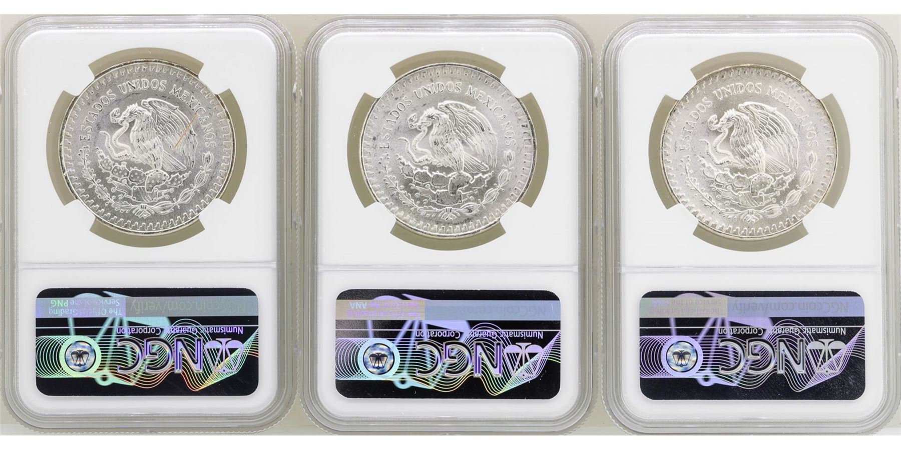One Lot of 1982Mo/1983Mo/1985Mo Mexico Libertad Onza Silver Coins NGC MS66. NGC Certified.