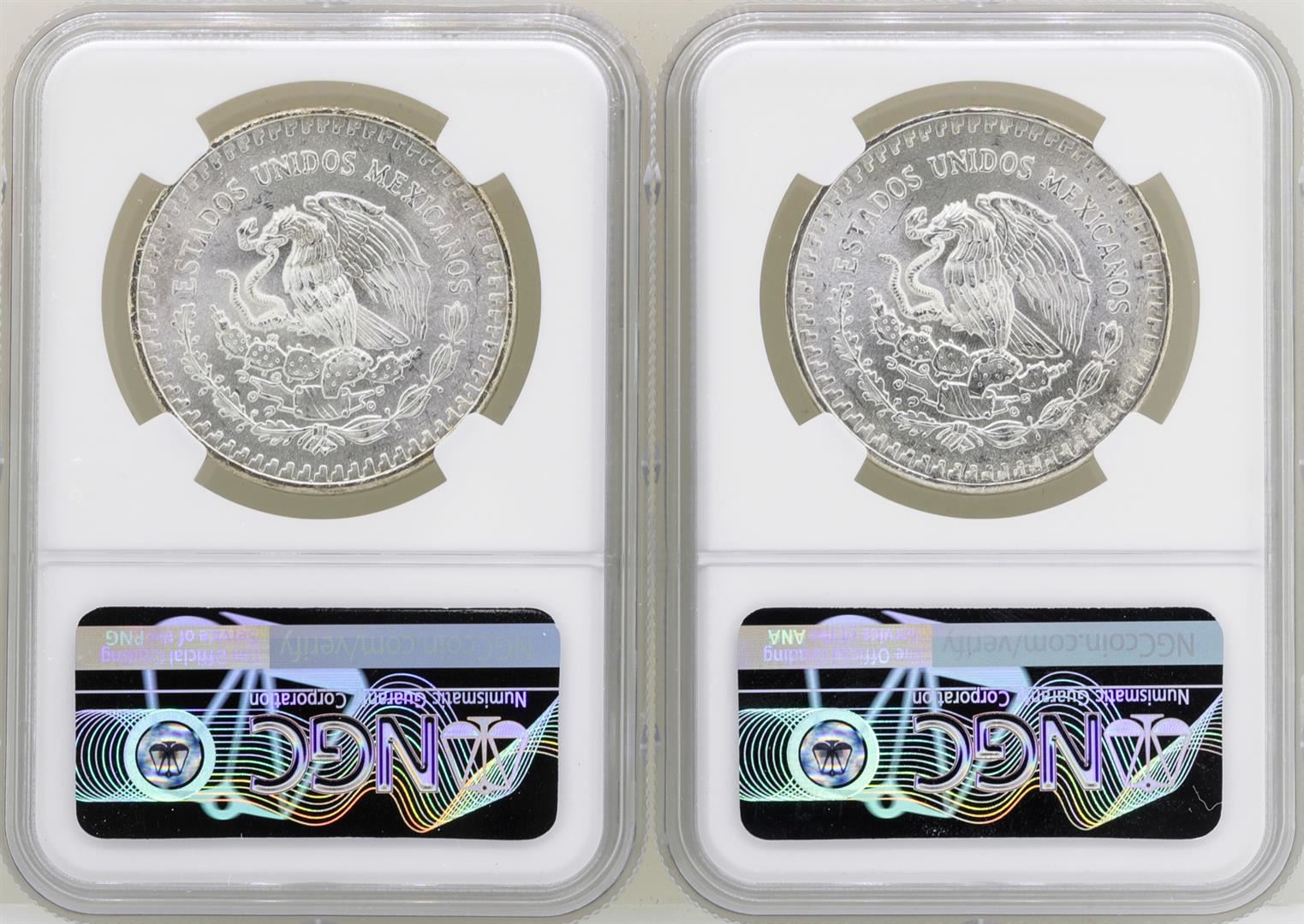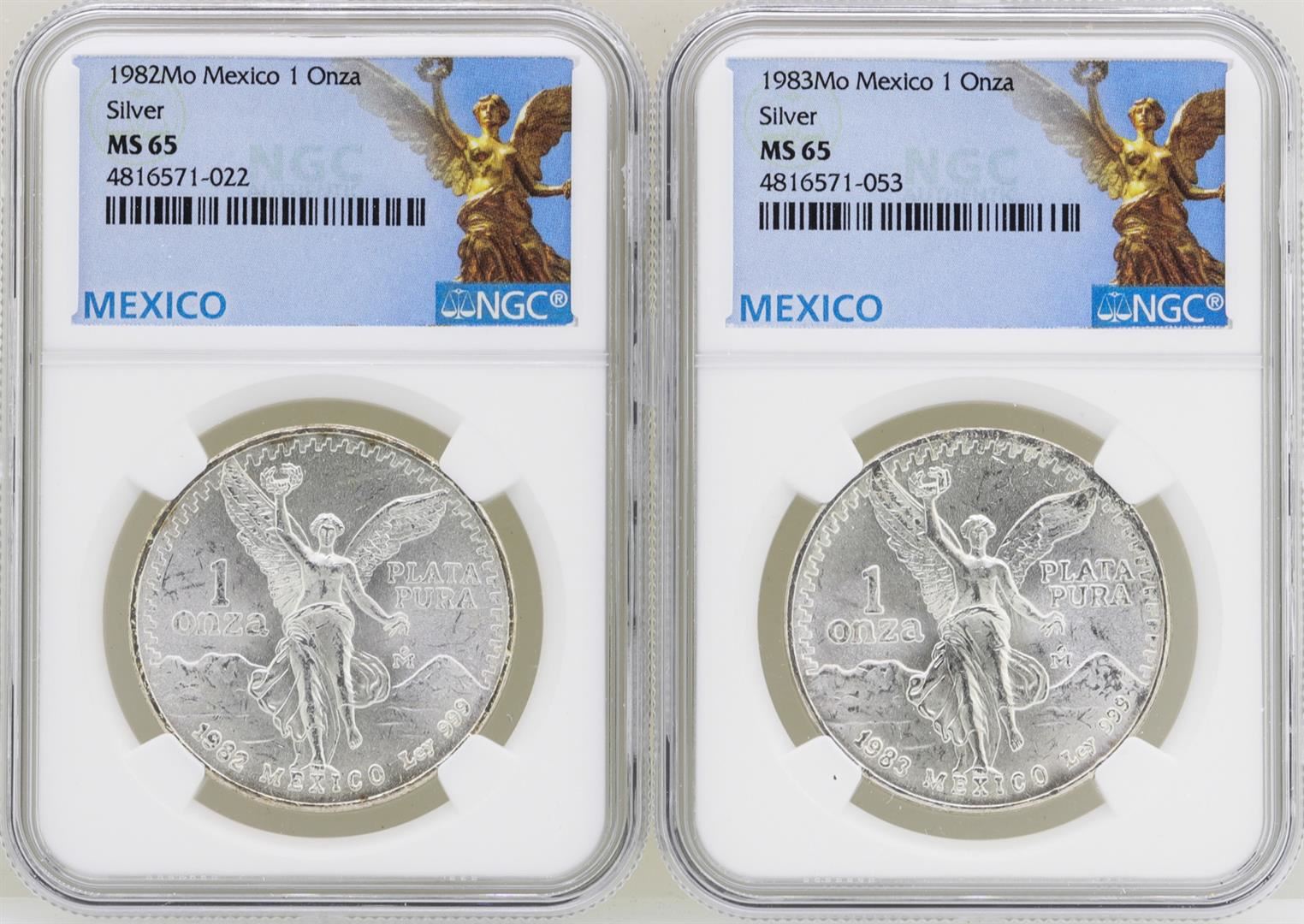 One Lot of 1982Mo & 1983Mo Mexico Libertad Onza Silver Coins NGC MS65. NGC Certified.
