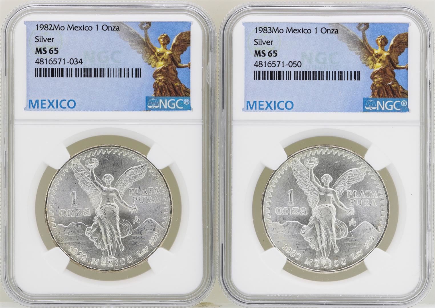 One Lot of 1982Mo & 1983Mo Mexico Libertad Onza Silver Coins NGC MS65. NGC Certified.