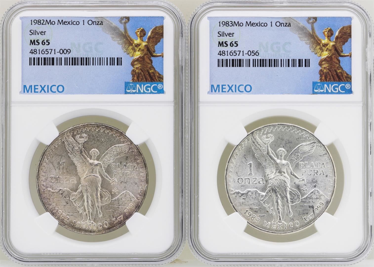 One Lot of 1982Mo & 1983Mo Mexico Libertad Onza Silver Coins NGC MS65. NGC Certified.