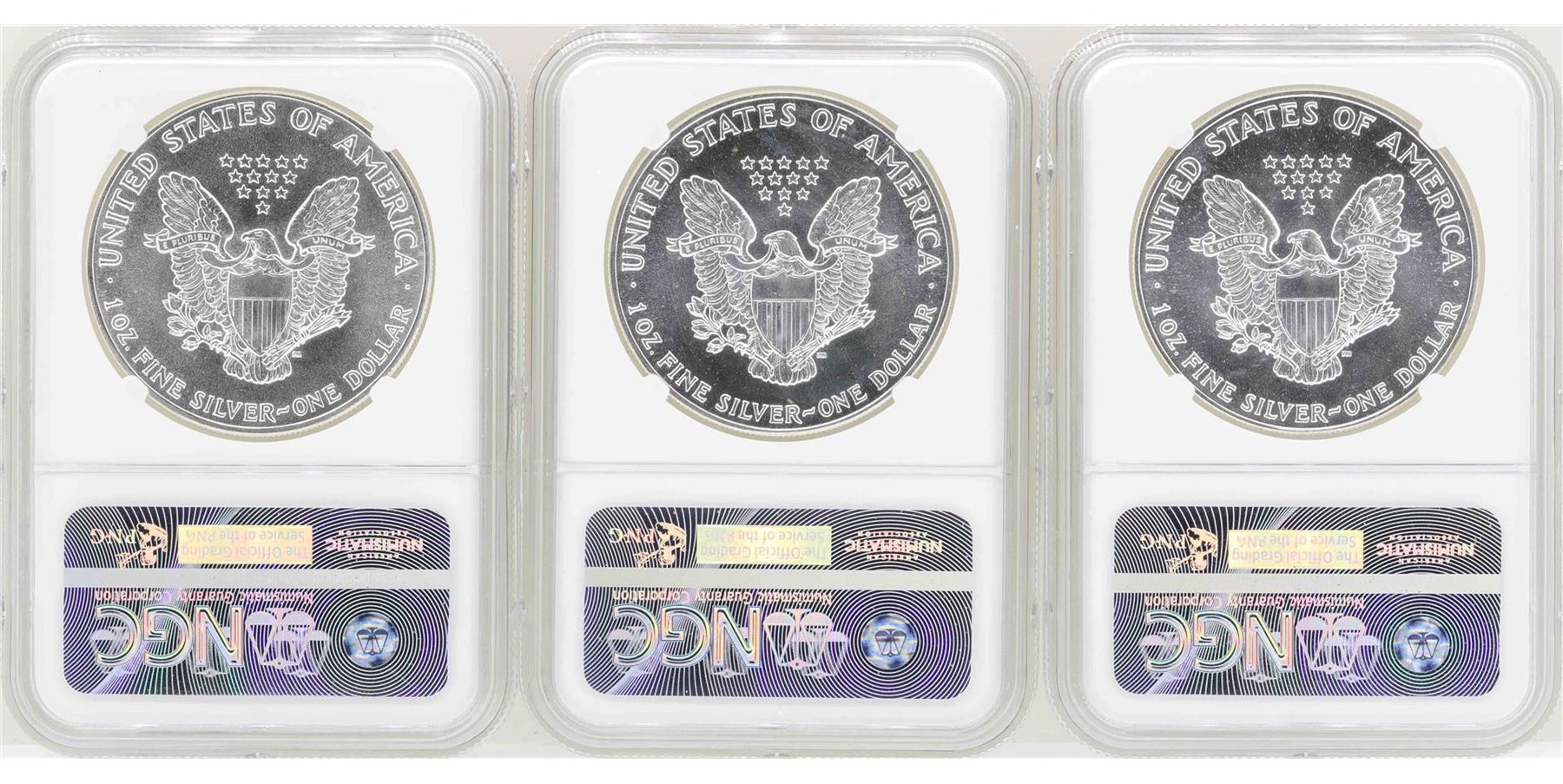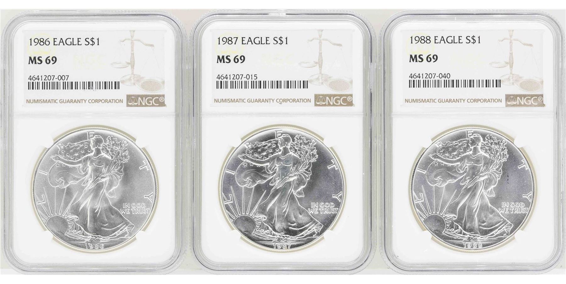 One Lot of 1986-1988 $1 American Silver Eagle Coins NGC MS69. NGC Certified.