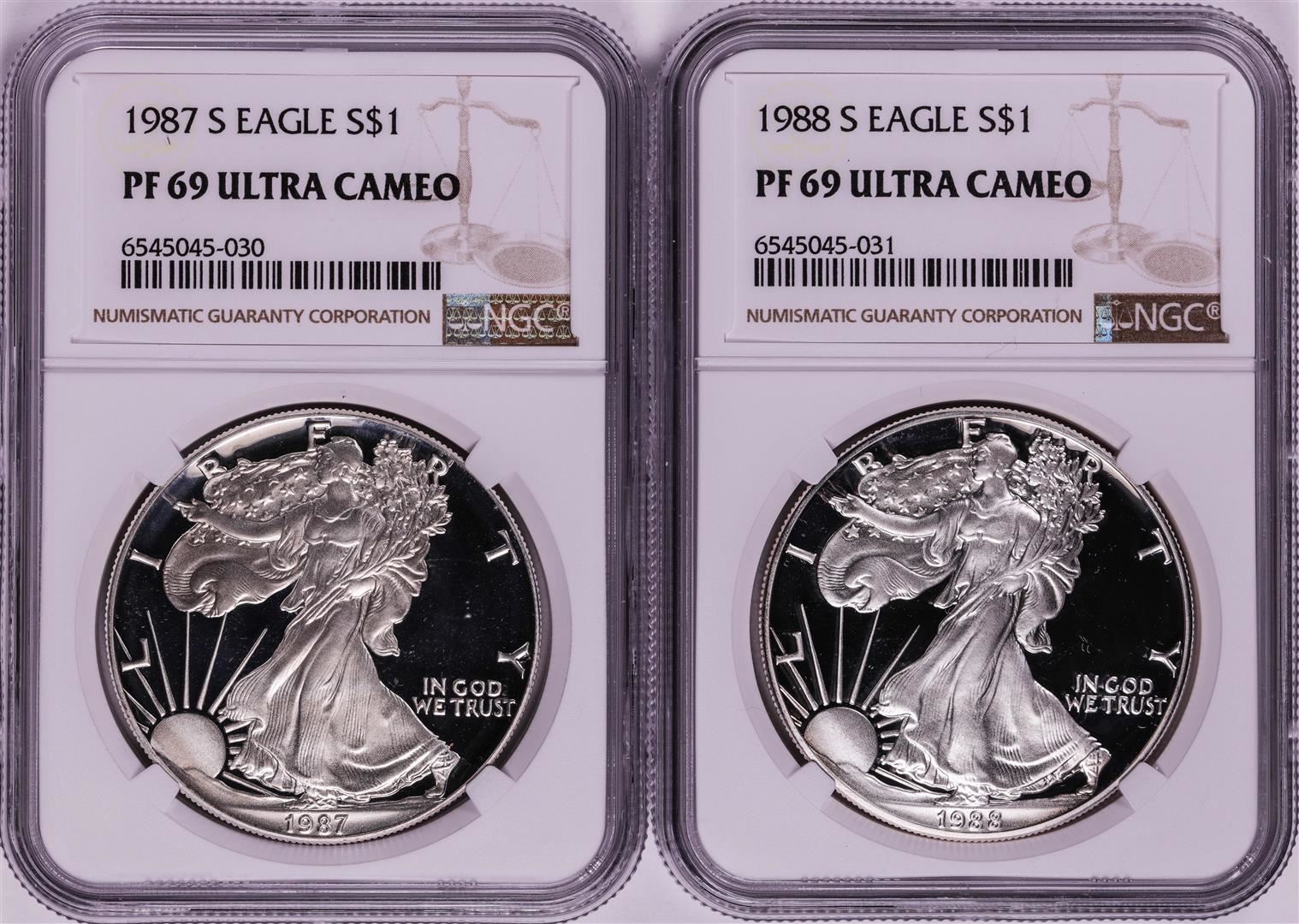 One Lot of 1987-1988 $1 Proof American Silver Eagle Coins NGC PF69 Ultra Cameo. NGC Certified.