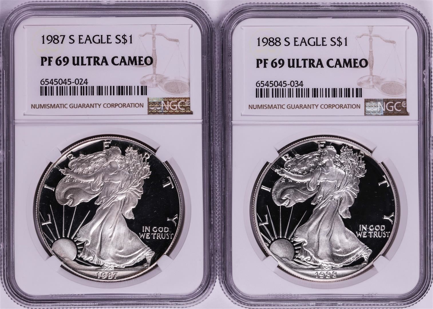 One Lot of 1987-1988 $1 Proof American Silver Eagle Coins NGC PF69 Ultra Cameo. NGC Certified.
