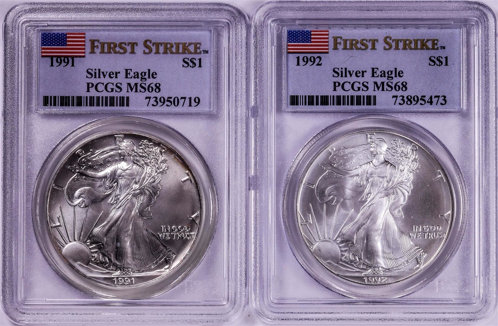 One Lot of 1991-1992 $1 American Silver Eagle Coins PCGS MS68 First Strike. PCGS Graded.