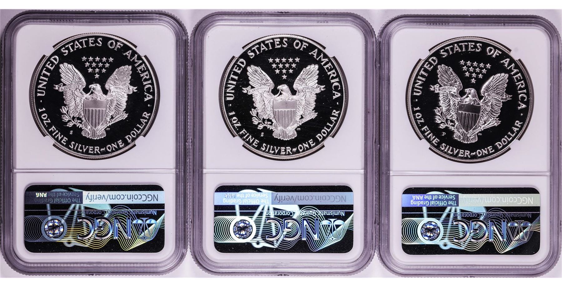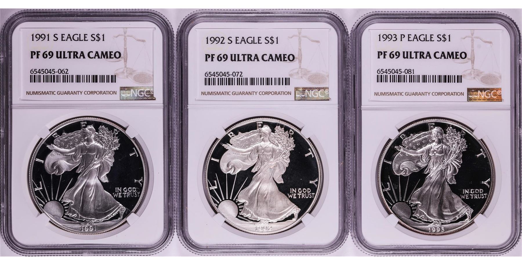 One Lot of 1991-1993 $1 Proof American Silver Eagle Coins NGC PF69 Ultra Cameo. NGC Certified.