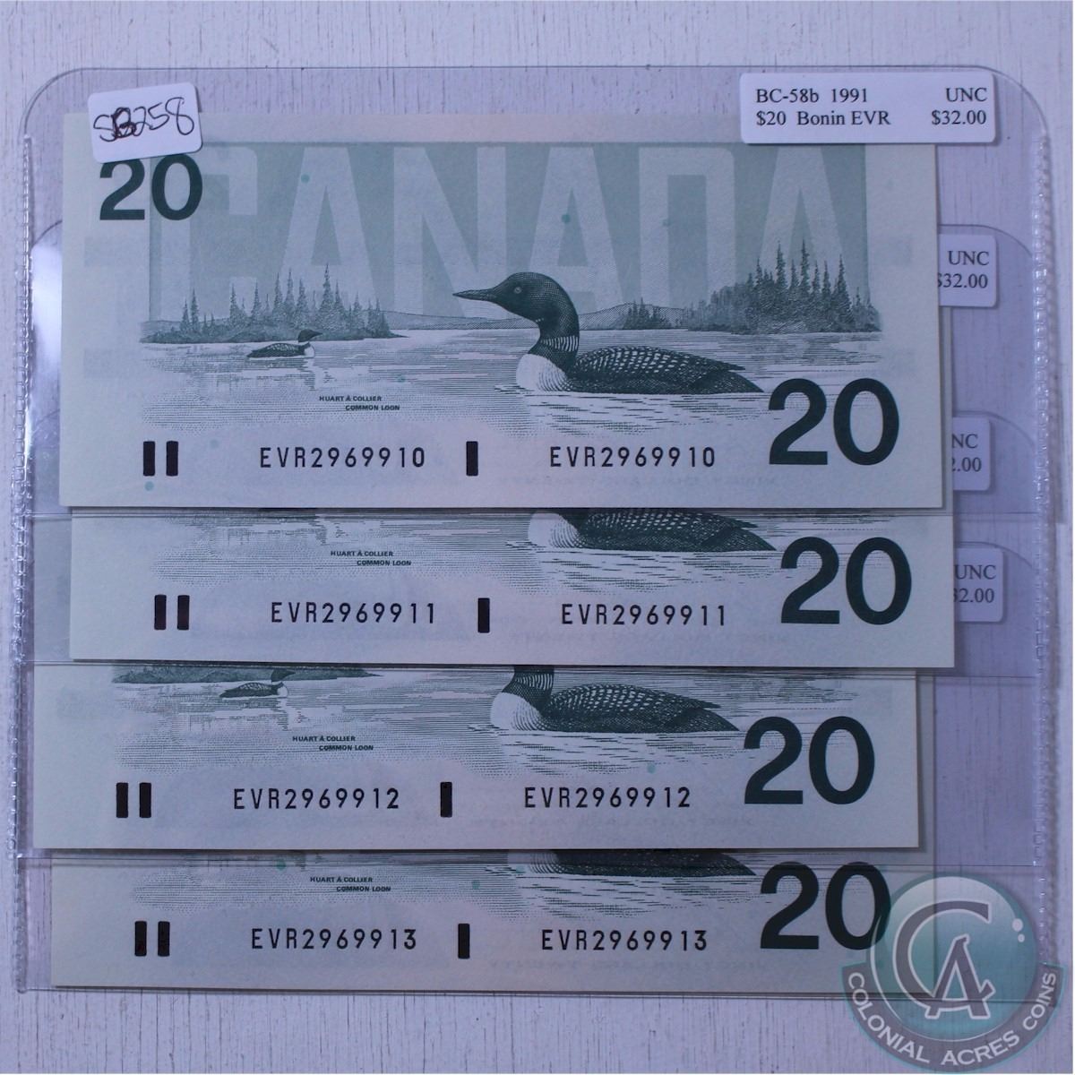 Lot of 1991 $20 consecutive serial numbers. BC-58b, Bonin-Thiessen, S/N: EVR2969910 to EVR2969913 Un