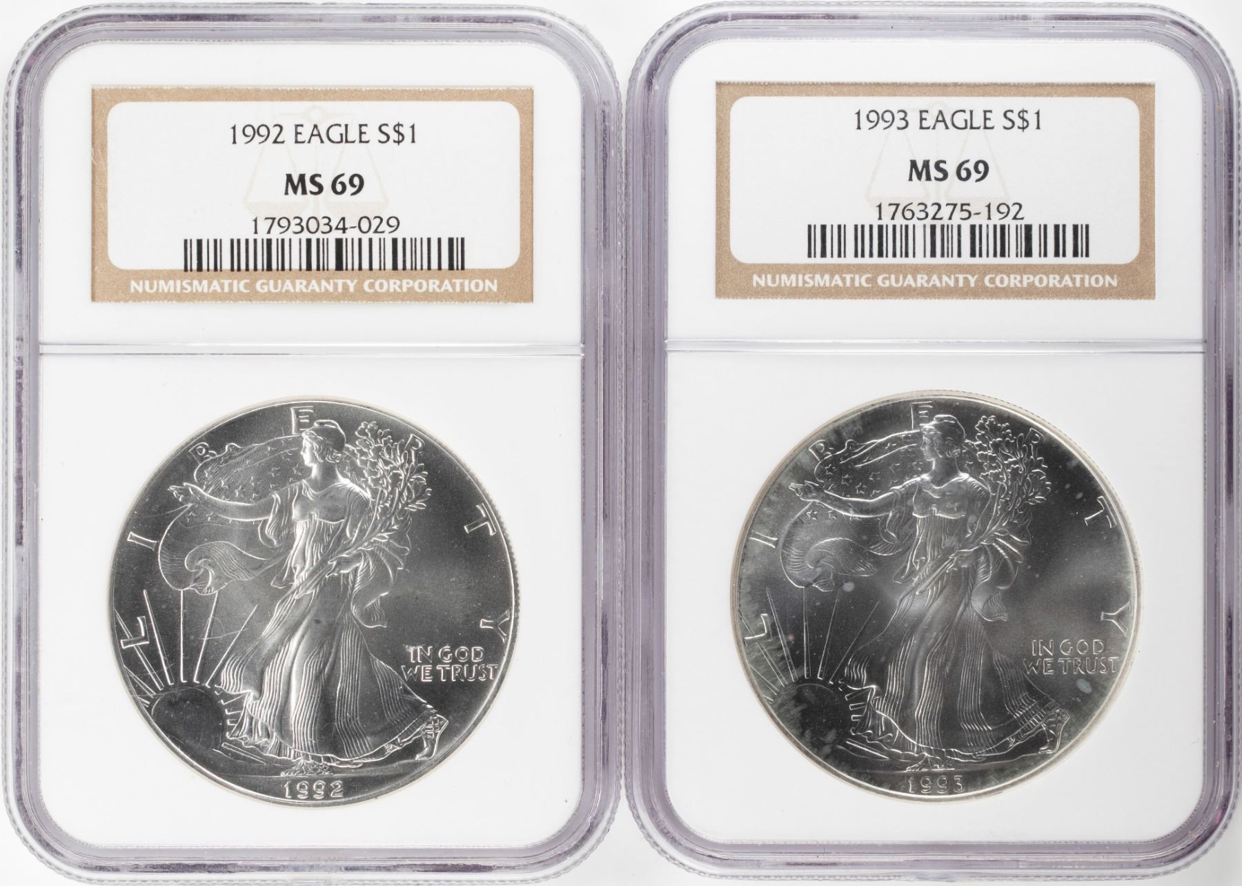 One Lot of 1992-1993 $1 American Silver Eagle Coins NGC MS69.