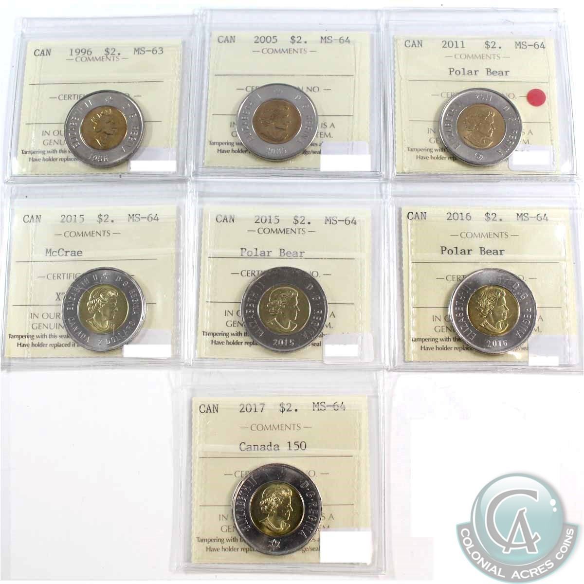 Lot of 1996-2017 Canada $2 ICCS Certified MS-64 Except 1996 MS-63 - 1996, 2005, 2011, 2015 McCrae, 2015, 2016 & 2017 Canada 150. 7pcs