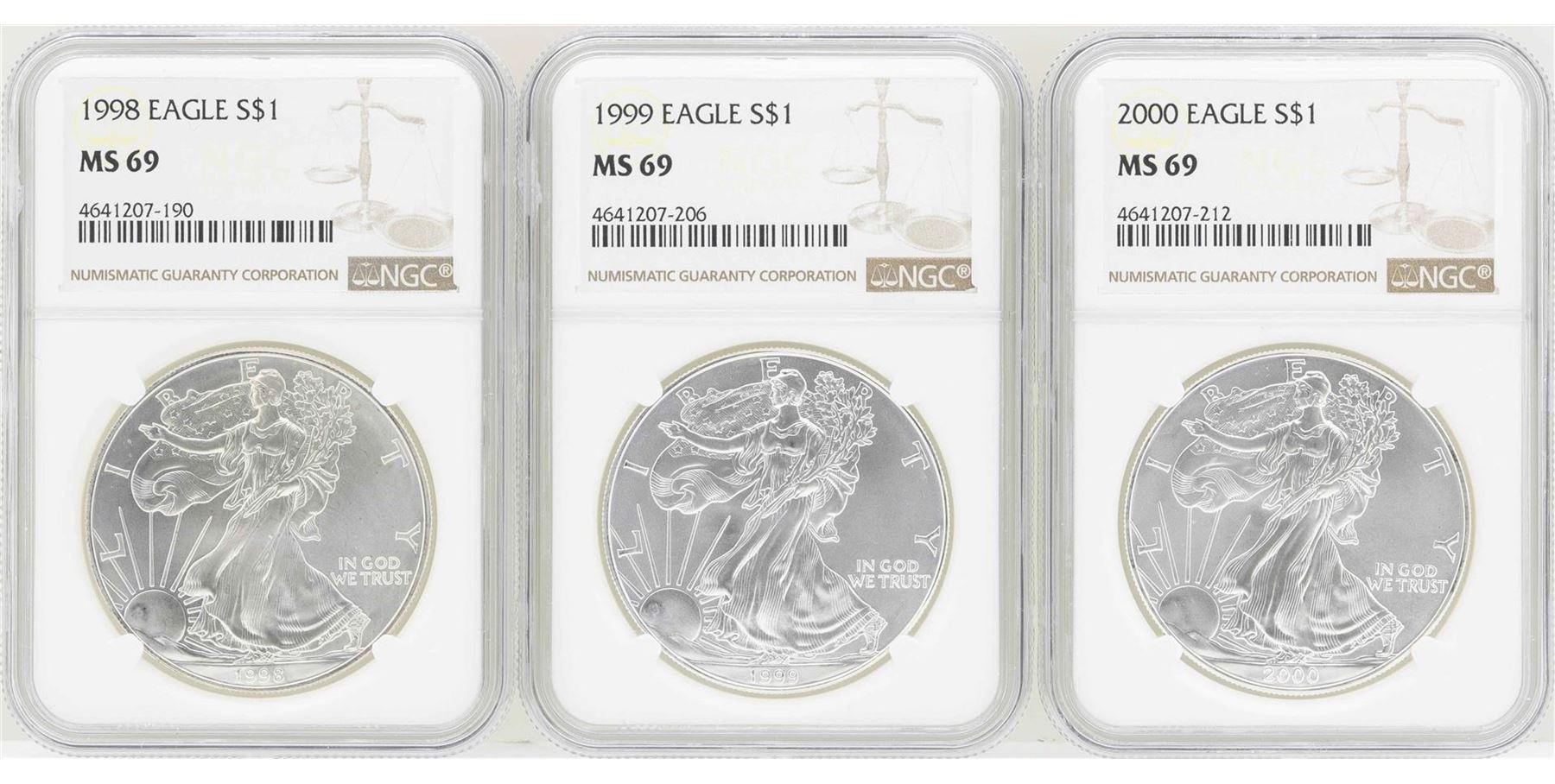 One Lot of 1998-2000 $1 American Silver Eagle Coins NGC MS69. NGC Certified.