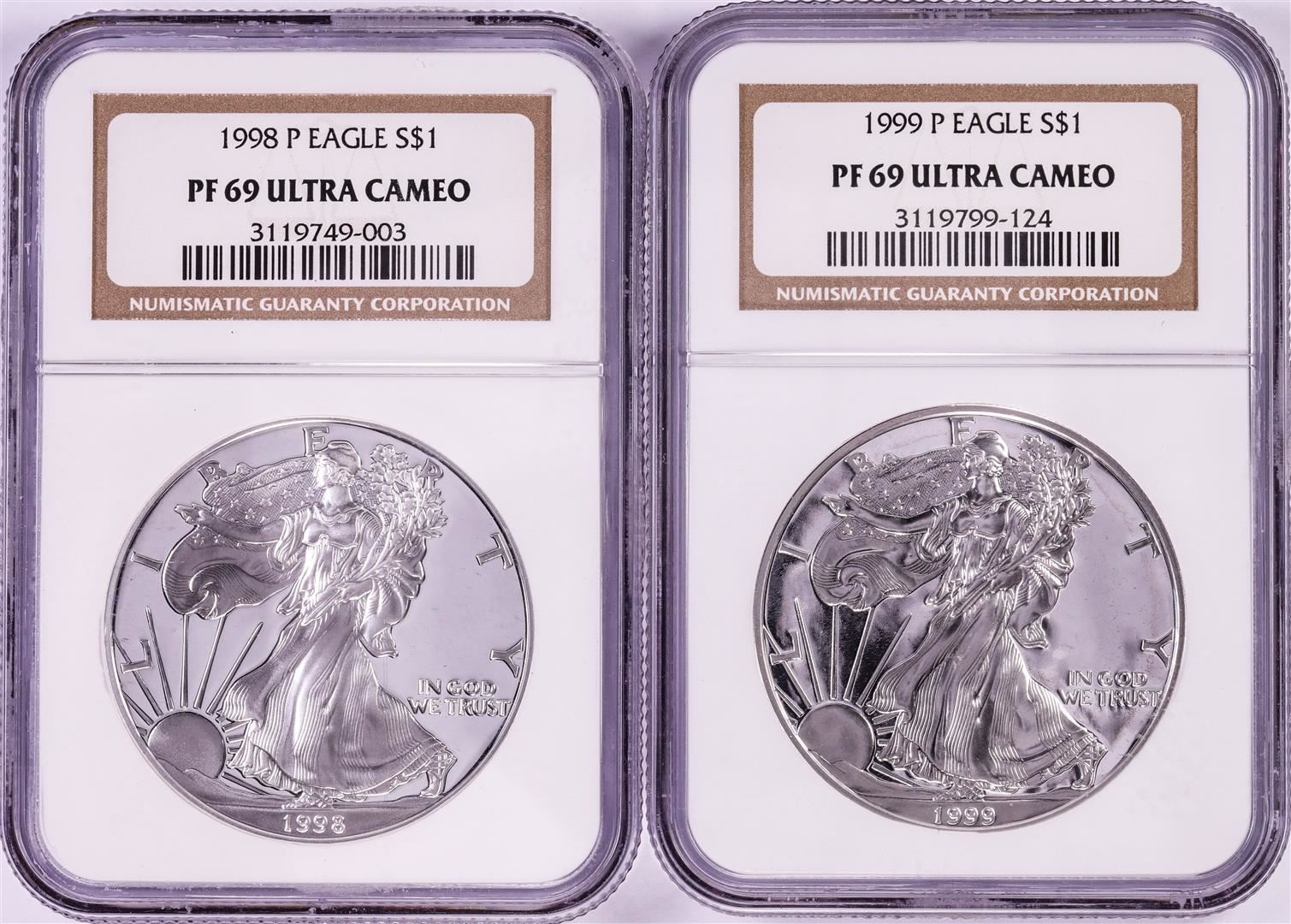 One Lot of 1998-P to 1999-P $1 Proof American Silver Eagle Coins NGC PF69 Ultra Cameo. NGC Certified.