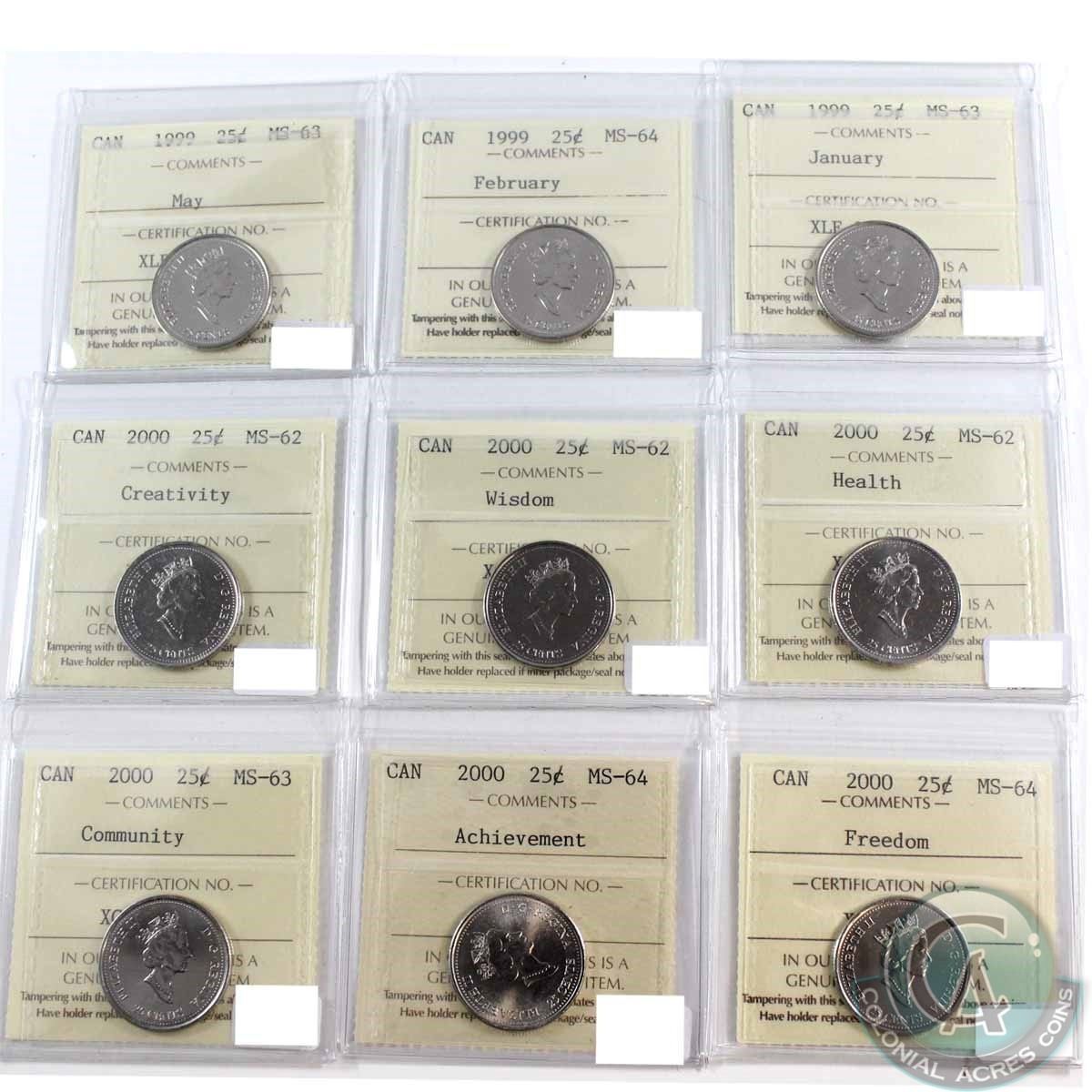 Lot of 1999 & 2000 Canada Millennium 25-cent ICCS Certified MS-62, 63 & 64 - 1999 May, February, January & 2000 Creativity, Wisdom, Health, Community, Achievement, & Freedom. 9pcs