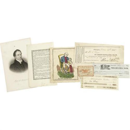 <B>Lot of 19th Century Ephemera</B></I>. A lot of seven items including a hand-colored illustration, 5” x 6.5”, entitled “My Dear Grandfather”, a one page printed “Rules of the Ulster County Bank”, two 1847 checks each drawn on the Philadelphia Bank, a small label from Philadelphia Manufactory from a bolt of cloth, a receipt for a six month subscription to the Philadelphia <I>Independent Democrat</B></I> dated October 28, 1835, and a page excised from a book with an engraved illustration of Robert Young Hayne, governor of South Carolina. All items in very good condition. <I>Ex. Henry E. Luhrs Collection</B></I>.<BR><BR><b>Shipping:</b> Flat Material, Small (<a target="_blank" href="http://www.heritageauctions.com/common/shipping.php">view shipping information</a>)