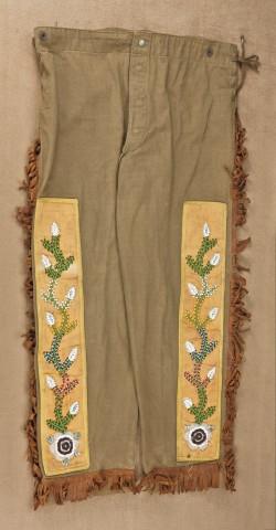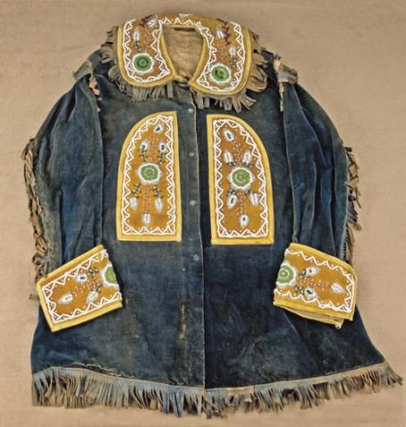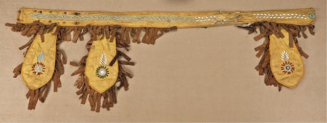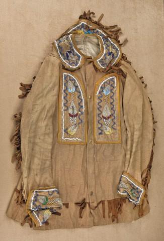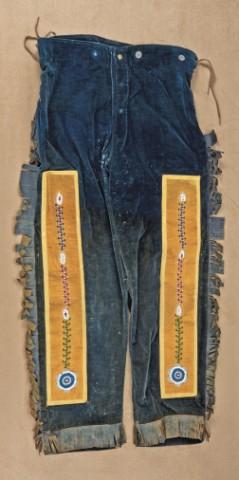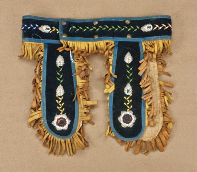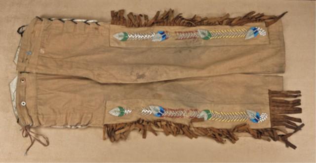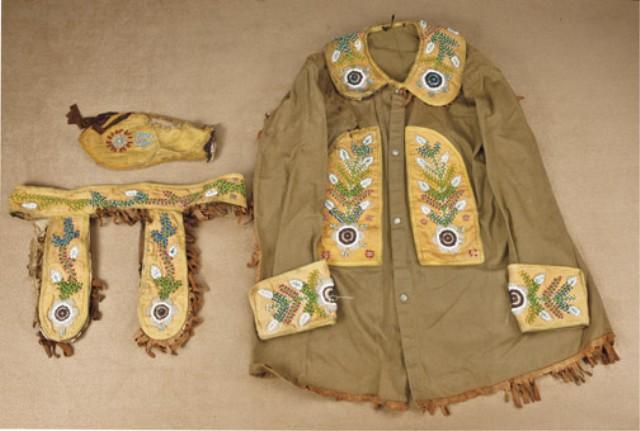 Lot of 19th century costumes made for Wild West show Indians, consisting of three complete sets and extra accessories including two headdresses, one constructed of velvet with leather fringe, others cotton with fringe and beadwork. These outfits were made so that the Indians and wild west shows could be properly garbed and not offend Victorian sensibilities. The Indians had a tendency to be somewhat naked. Document stating 101 ranch provenance. The letter states that these wild west show suits were purchased by Donna Young of Texas from a small museum in Ponca City, OK. When the contents were sold 20 years ago from March 27th, 2000. The letter further states these suits were worn by Indians in Buffalo Bill’s Wild West Show, and on the 101 Ranch in the early 1900’s. The appraiser identifies the beadwork is Iroquois and the letter states the suits were made in Philadelphia, Pennsylvania by Louis Stillz and brothers. Letter signed by Anita Stiner of Hayden, ID who researched them. Est: $750 - $1,500