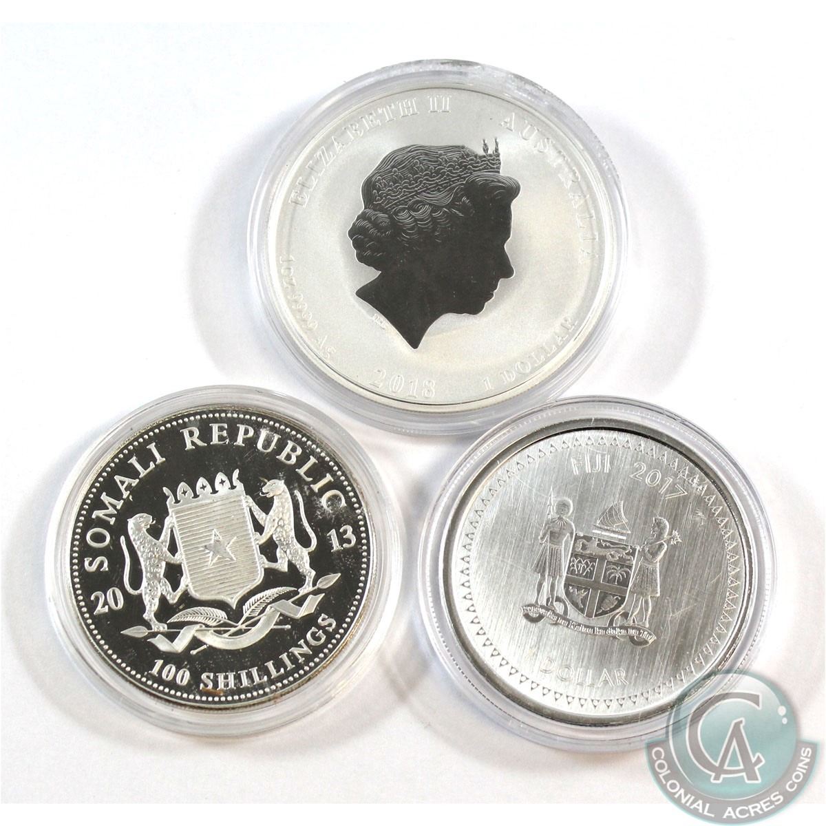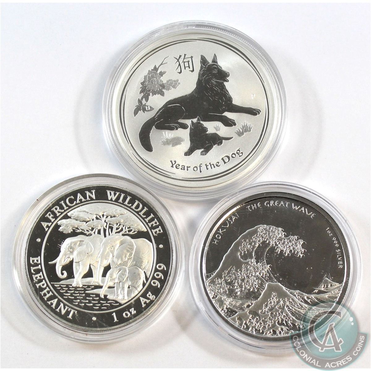 Lot of 1oz Fine Silver Coins (Tax Exempt). You will receive the 2013 African Elephant, 2017 Fiji The Great Wave, 2018 Australia Year of the Dog. Please note the capsule for the 2018 Dog has rim damage. 3pcs.