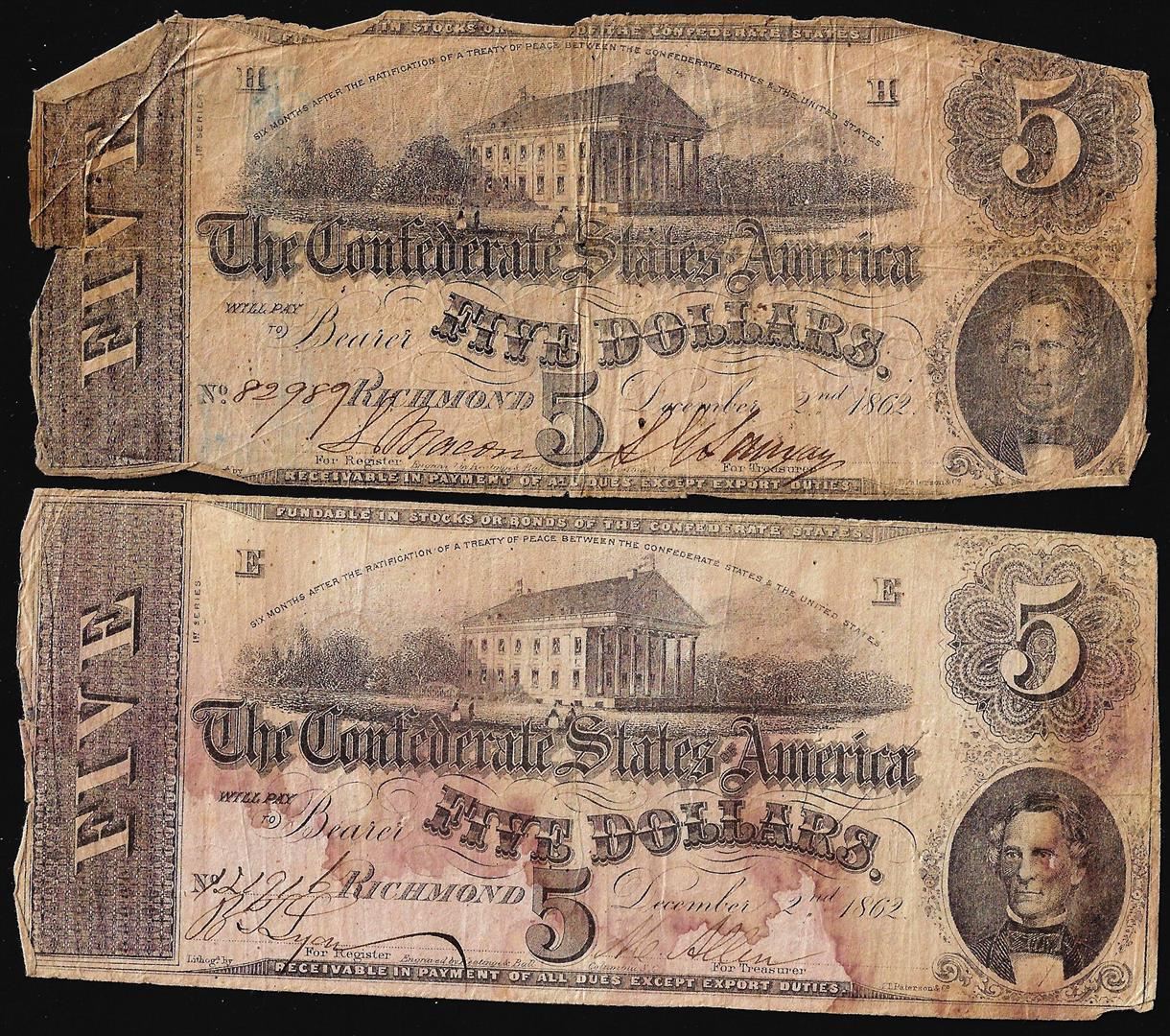 One Lot of (2) 1862 $5 Confederate States of America Notes.