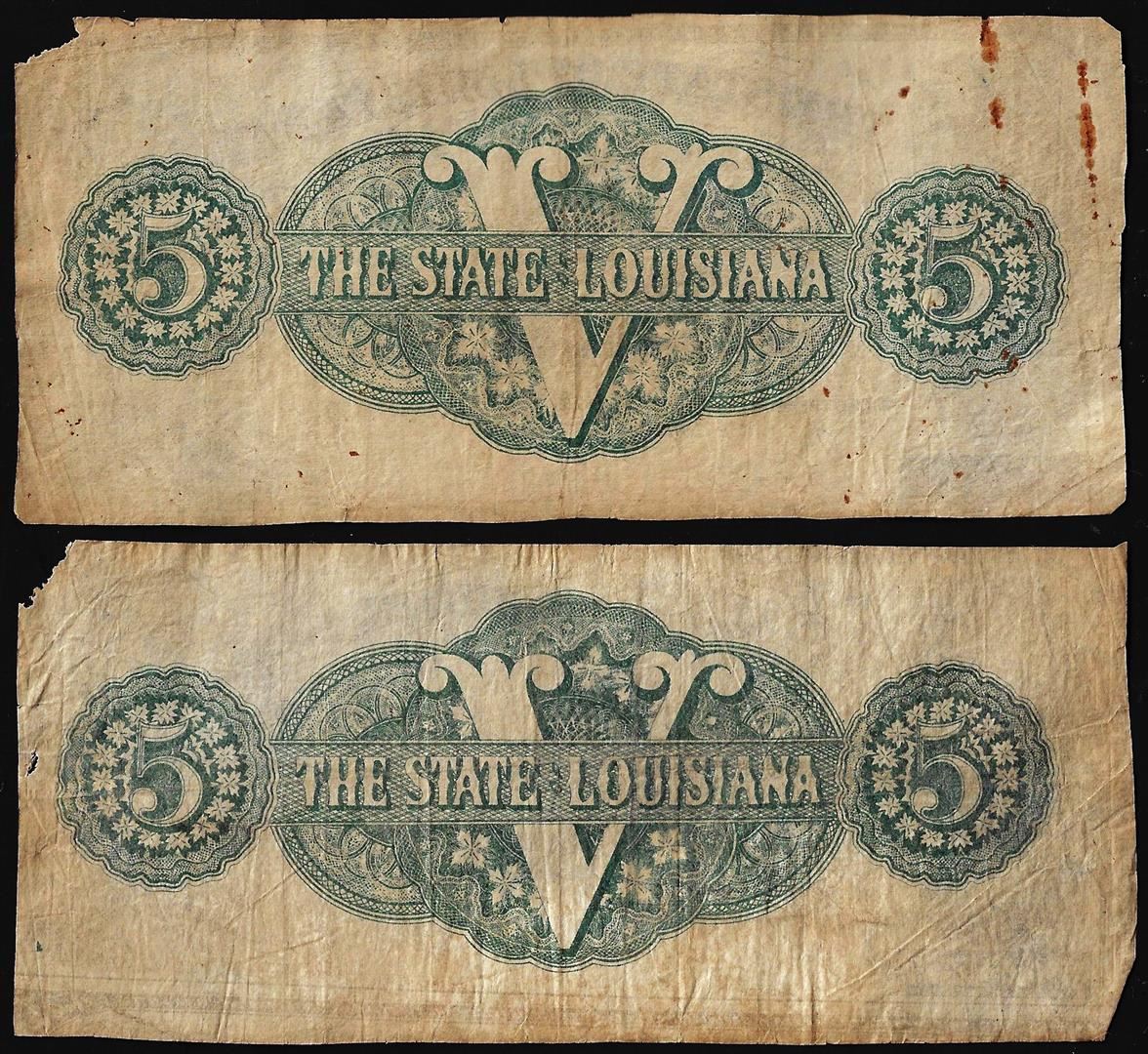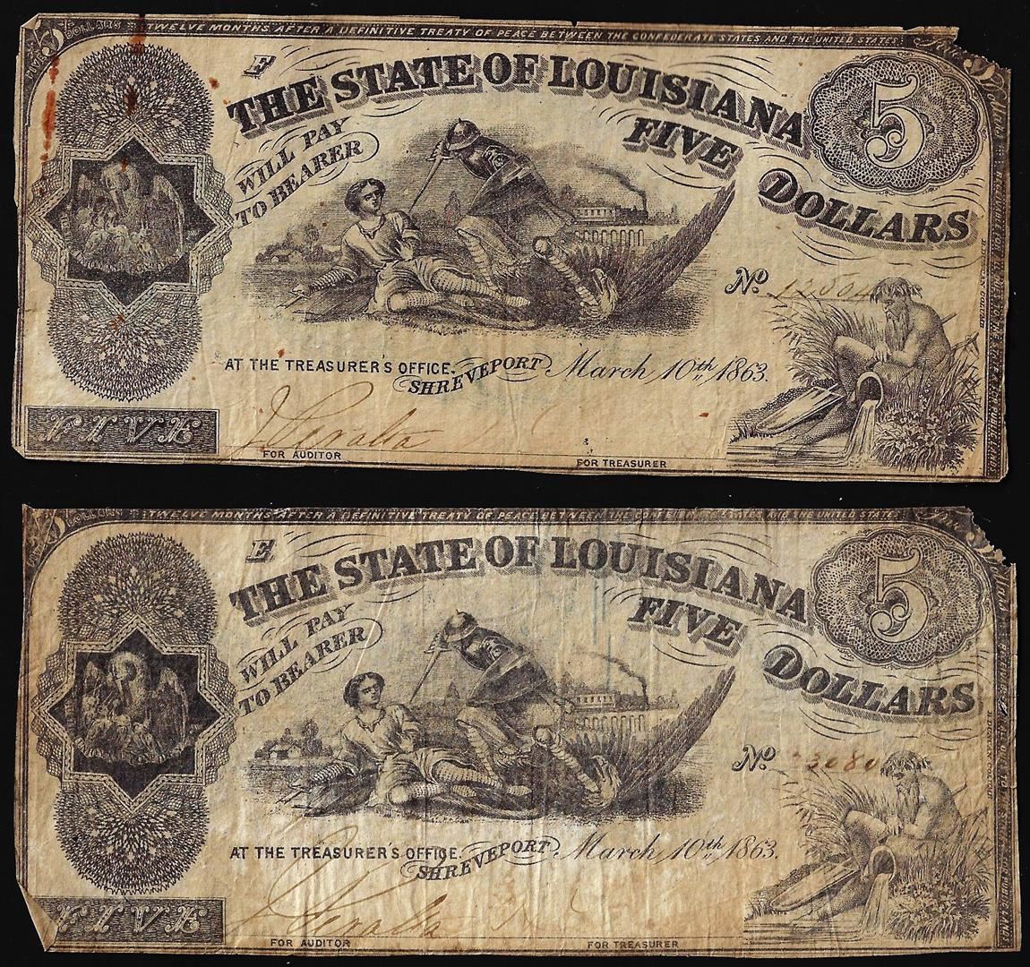 Lot of (2) 1863 $5 The State of Louisiana Baton Rouge, LA Obsolete Banknotes