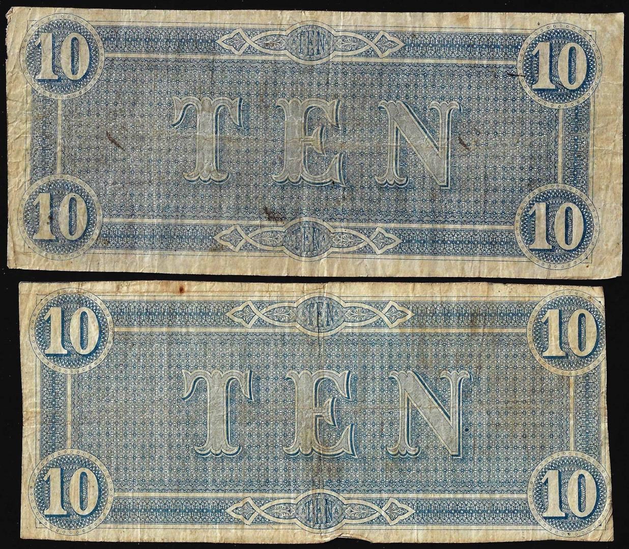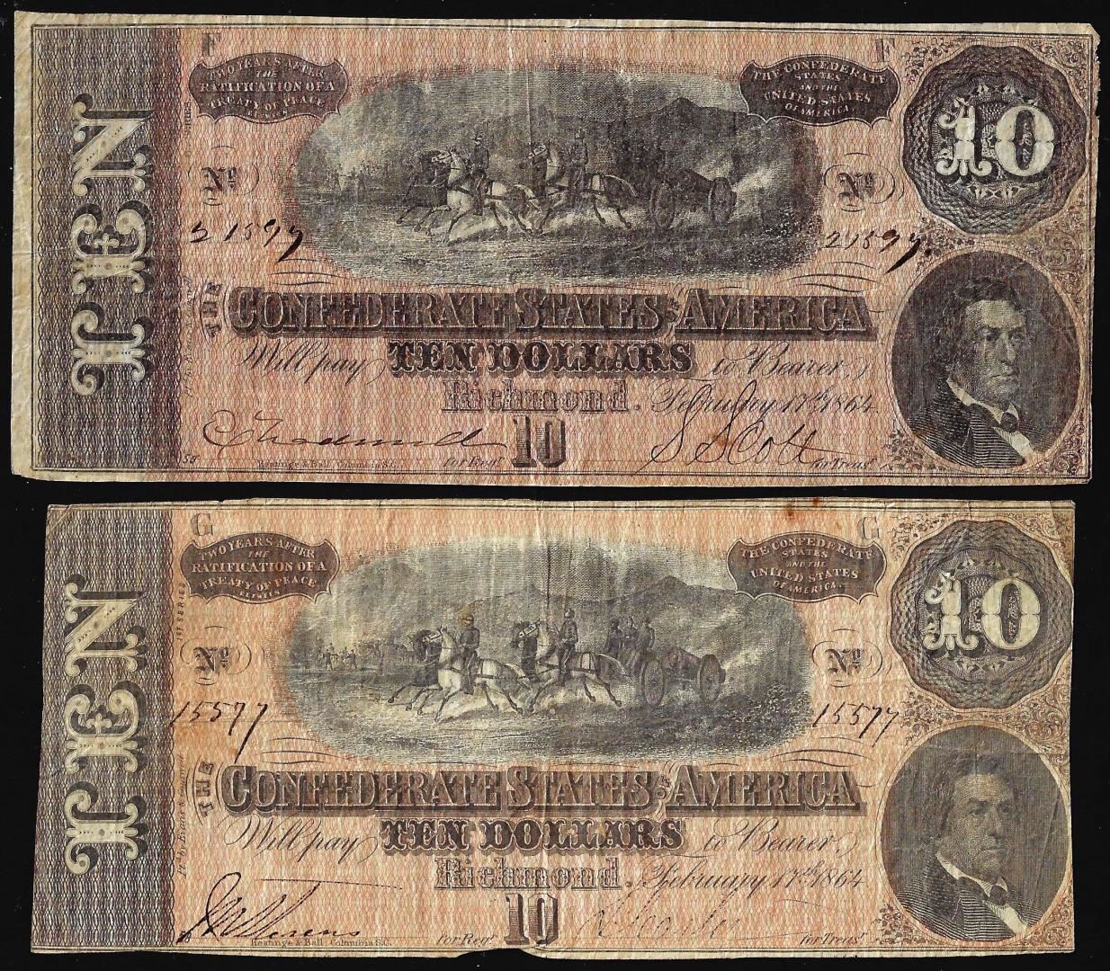 One Lot of (2) 1864 $10 Confederate States of America Notes.