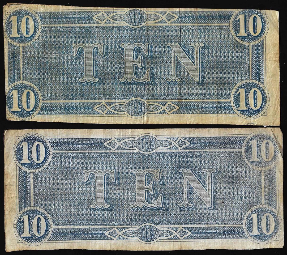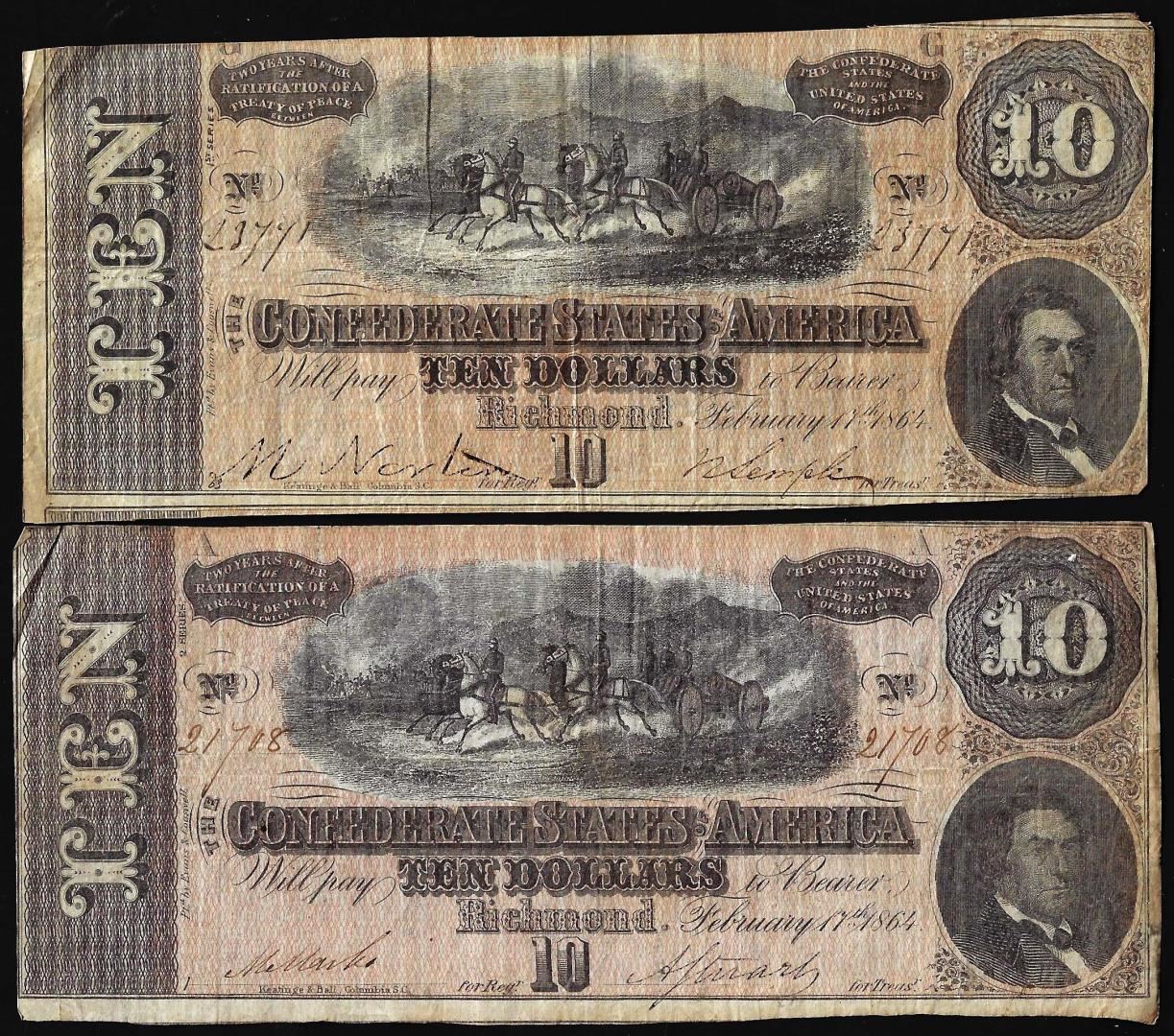 One Lot of (2) 1864 $10 Confederate States of America Notes.