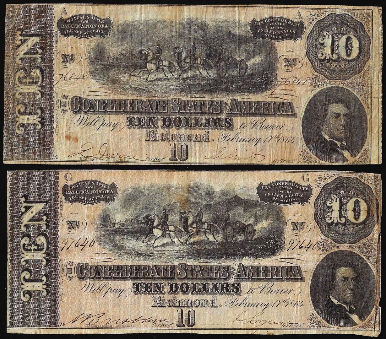 One Lot of (2) 1864 $10 Confederate States of America Notes.