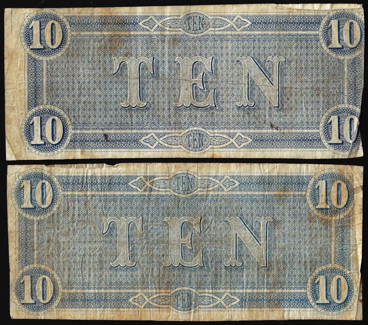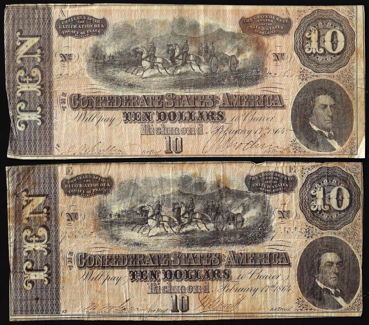One Lot of (2) 1864 $10 Confederate States of America Notes.