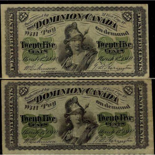 Lot of 2 1870 25¢ notes one plain and the other Ltr B. Both F/VF.