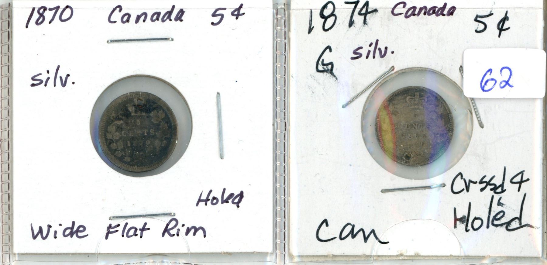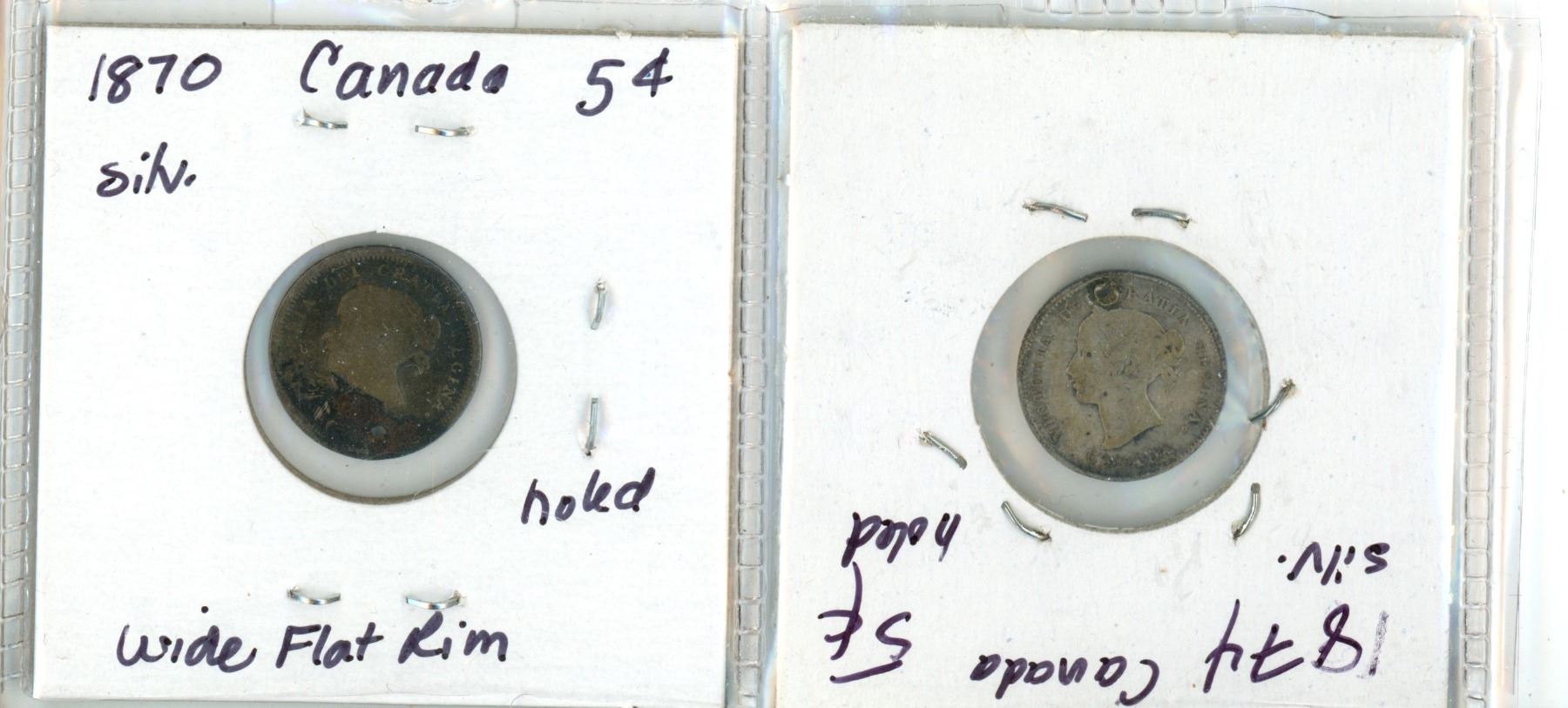 Lot of 2: 1870 WFR & 1874 Crssd 4 Canada Silver 5¢ (both holed)