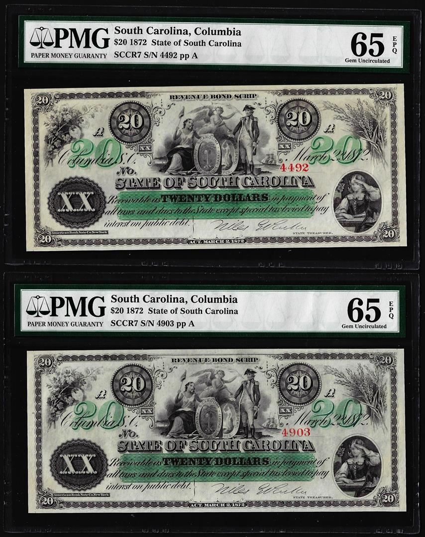 One Lot of (2) 1872 $20 State of South Carolina Obsolete Note PMG Gem Uncirculated 65EPQ. PMG Certified.