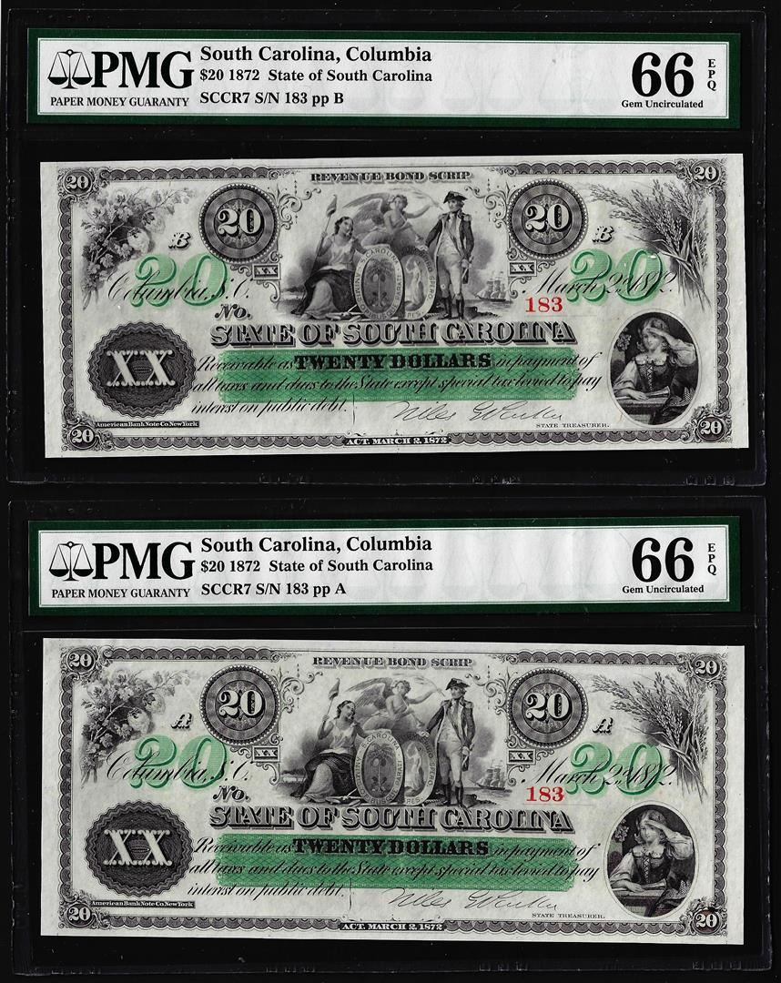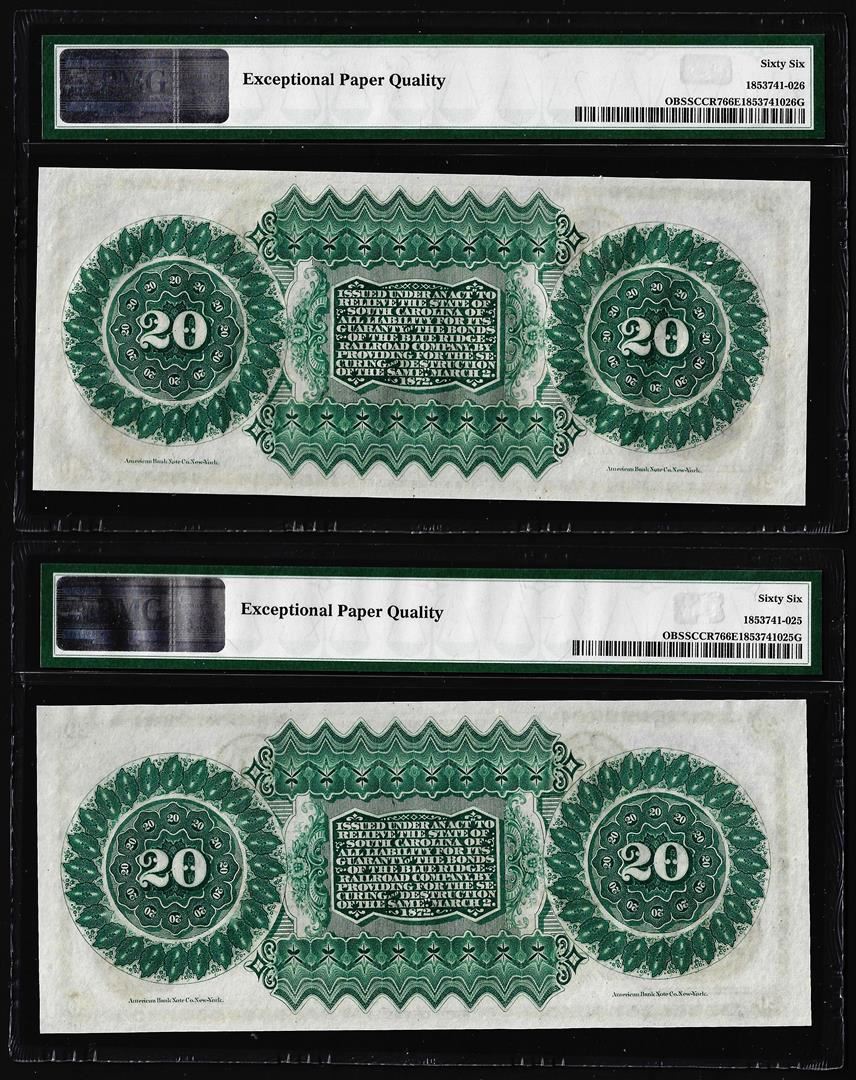 One Lot of (2) 1872 $20 State of South Carolina Obsolete Note PMG Gem Uncirculated 66EPQ. PMG Certified.