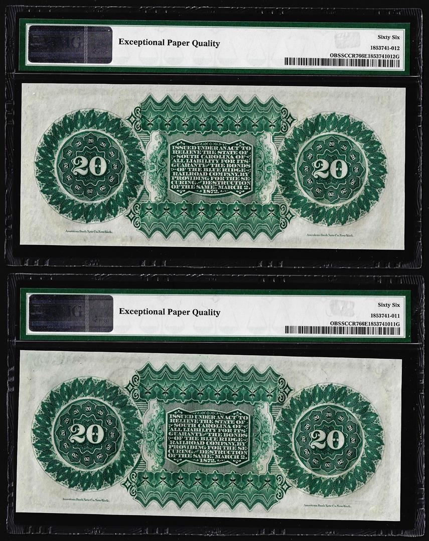 One Lot of (2) 1872 $20 State of South Carolina Obsolete Note PMG Gem Uncirculated 66EPQ. PMG Certified.