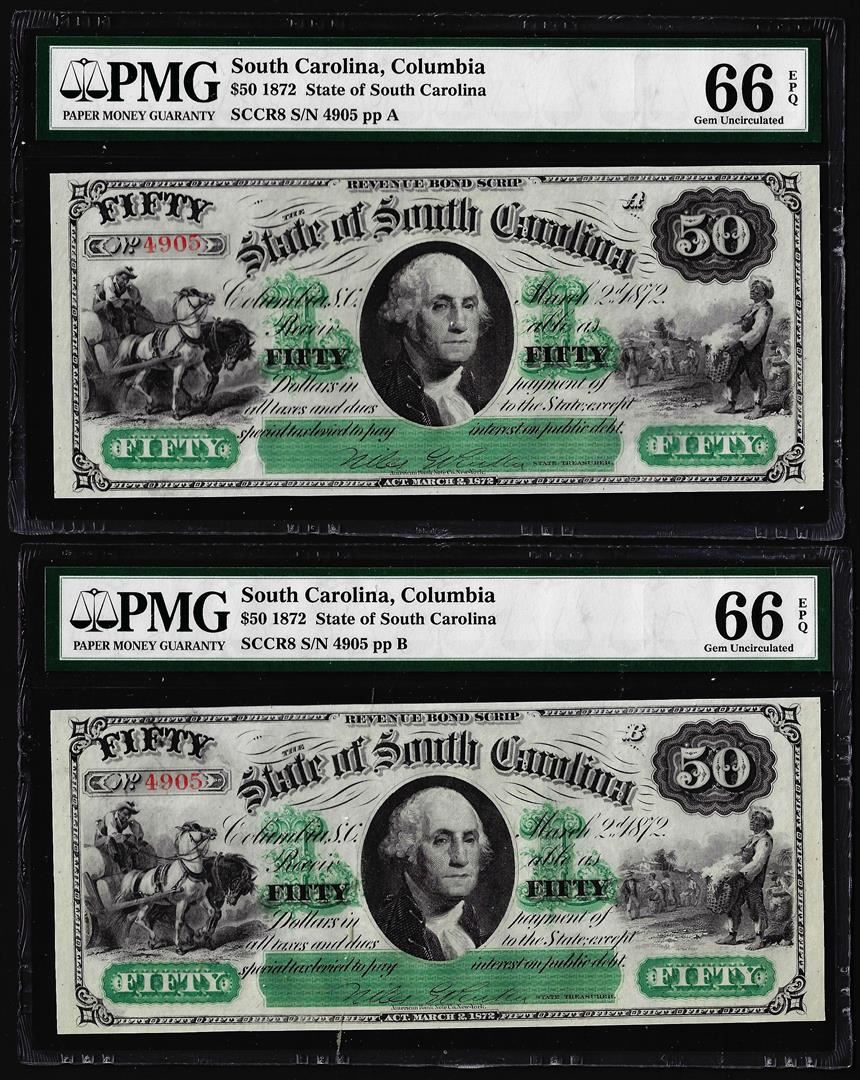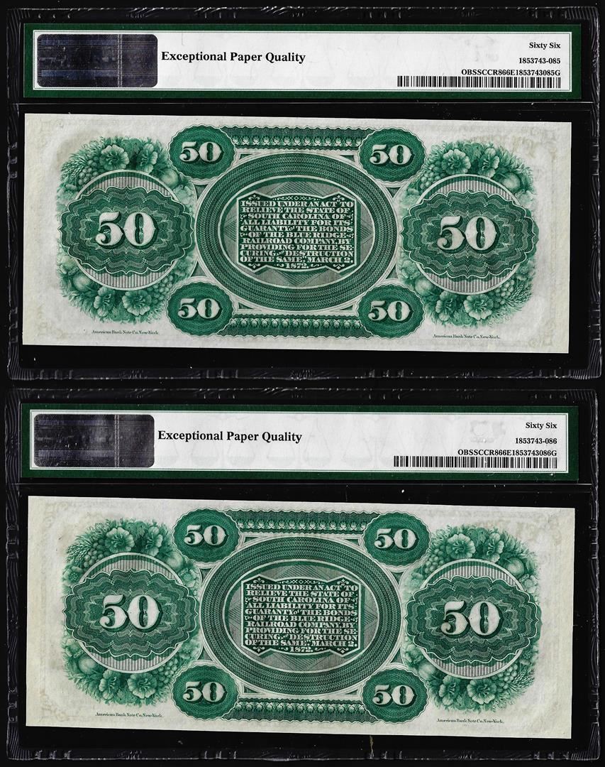 One Lot of (2) 1872 $50 State of South Carolina Obsolete Note PMG Gem Uncirculated 66EPQ. PMG Certified.