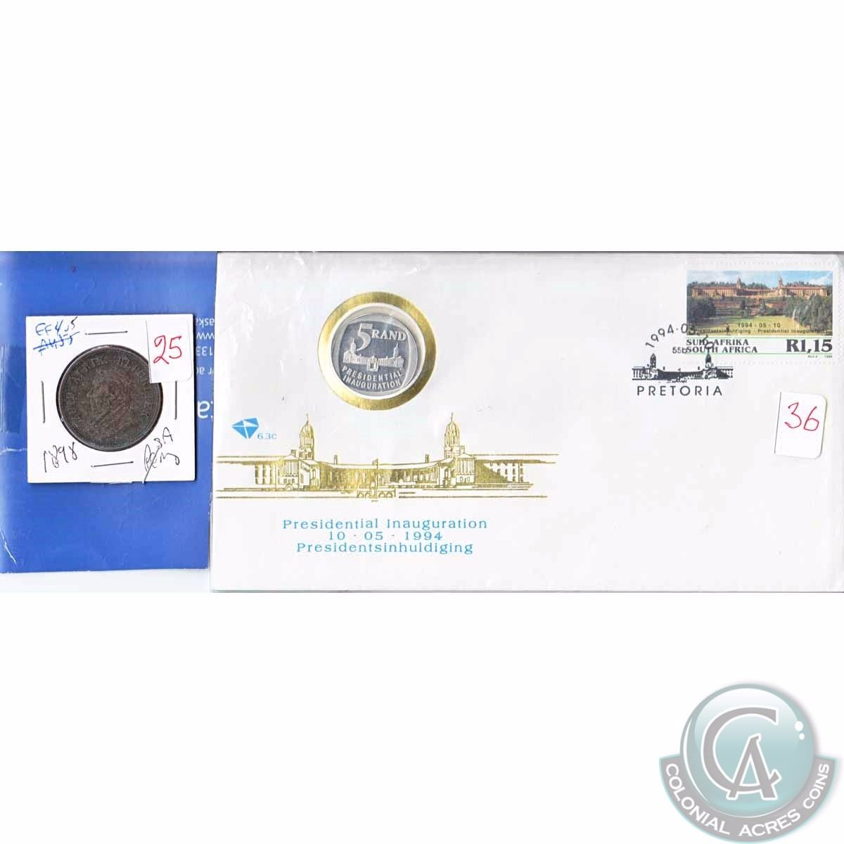 Lot of 2: 1898 Zuid Afrikaansche Republiek (South Africa) Bronze Penny EF-45, and 1994 First Day Cover South Africa 5 Rand and Stamp (Pretoria) Presidential Inauguration (low mintage)