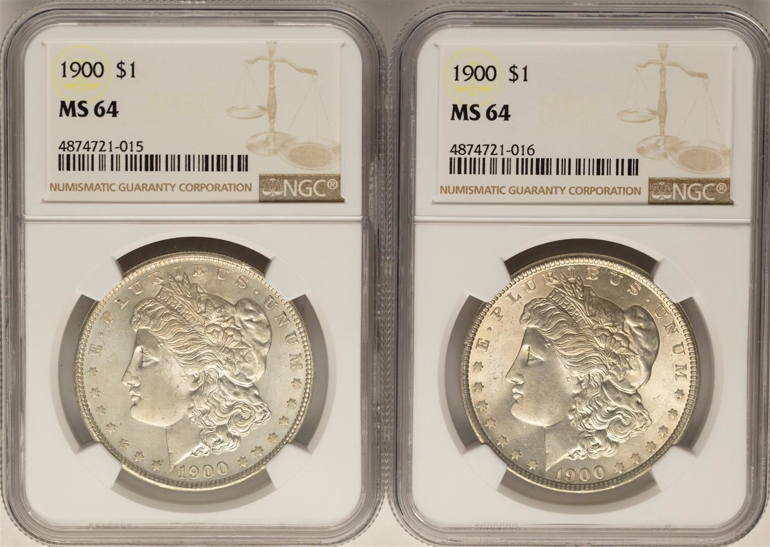 One Lot of (2) 1900 $1 Morgan Silver Dollar Coins NGC MS64. NGC Certified.