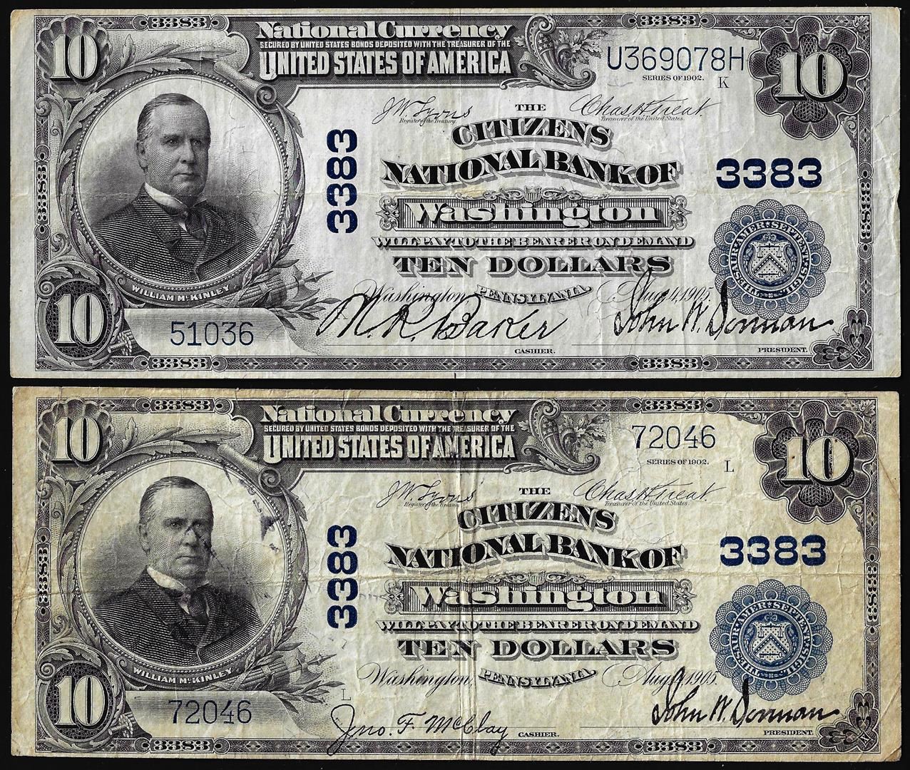 One Lot of (2) 1902 PB $10 Citizens NB of Washington, PA CH# 3383 National Currency Notes.