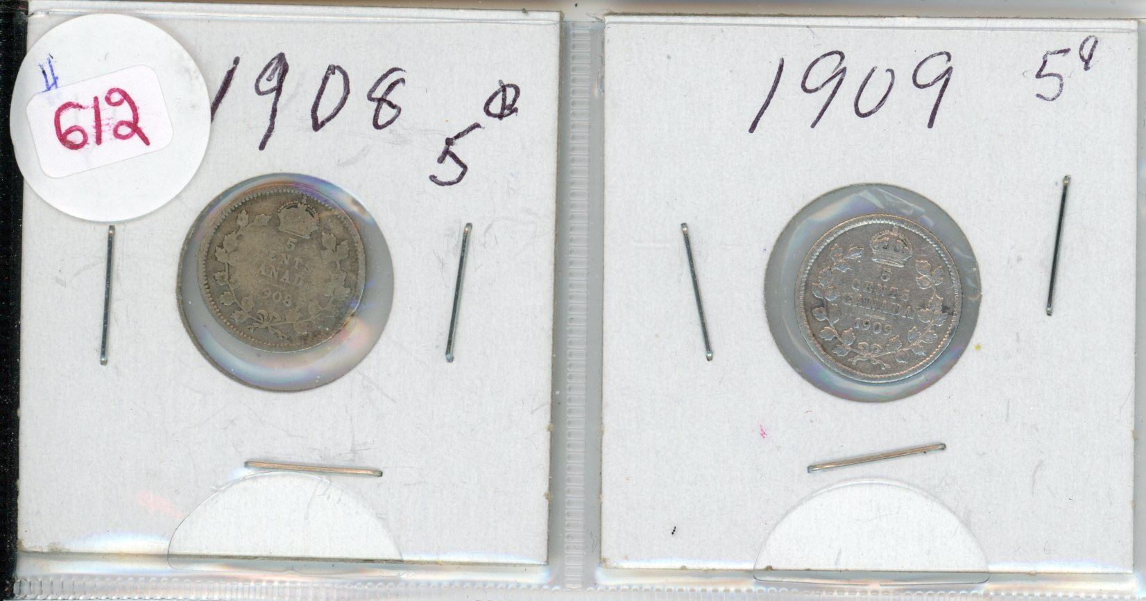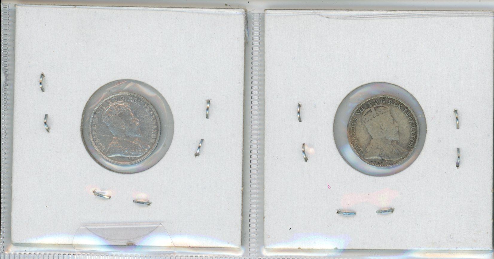 Lot of 2 1908+1909 silver Canadian small 5 cent coin