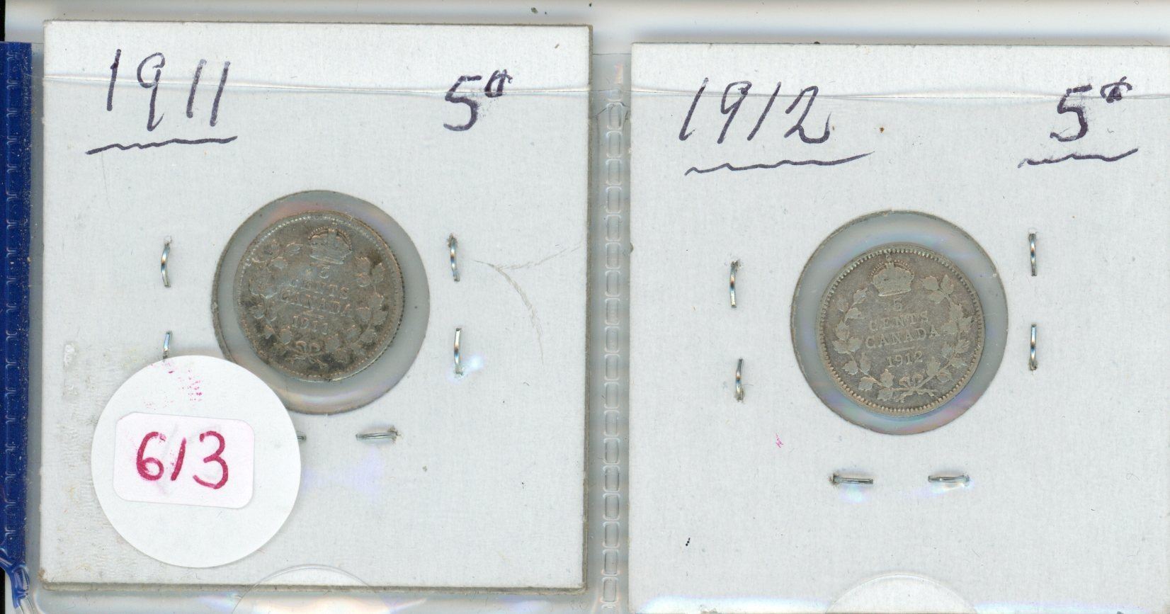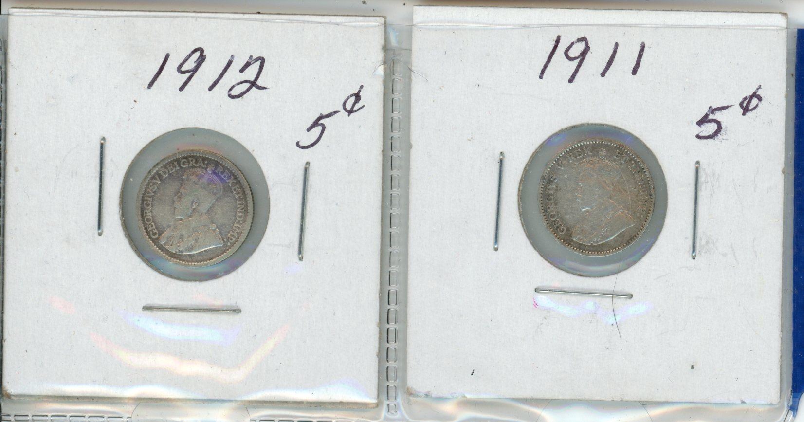 Lot of 2 1911+1912 silver Canadian small 5 cent coin