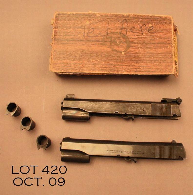 Lot of 2 1911 uppers, including a 1950’s production Government Model slide and barrel, barrel bushing requires fitting in very nice condition; and one Remington Rand slide with adjustable sights in rough condition and newerbarrel. Est. $250-$500.