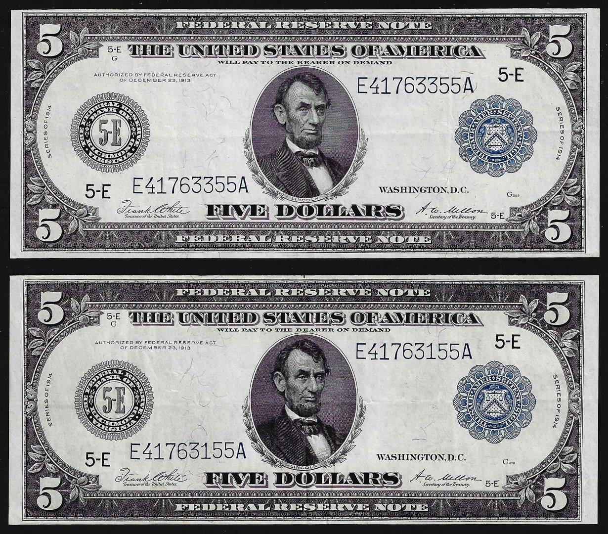 One Lot of (2) 1914 $5 Federal Reserve Notes Richmond.