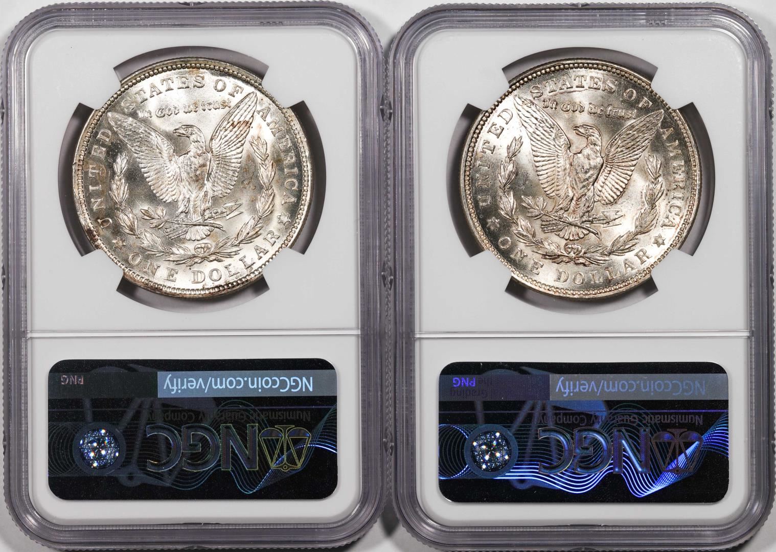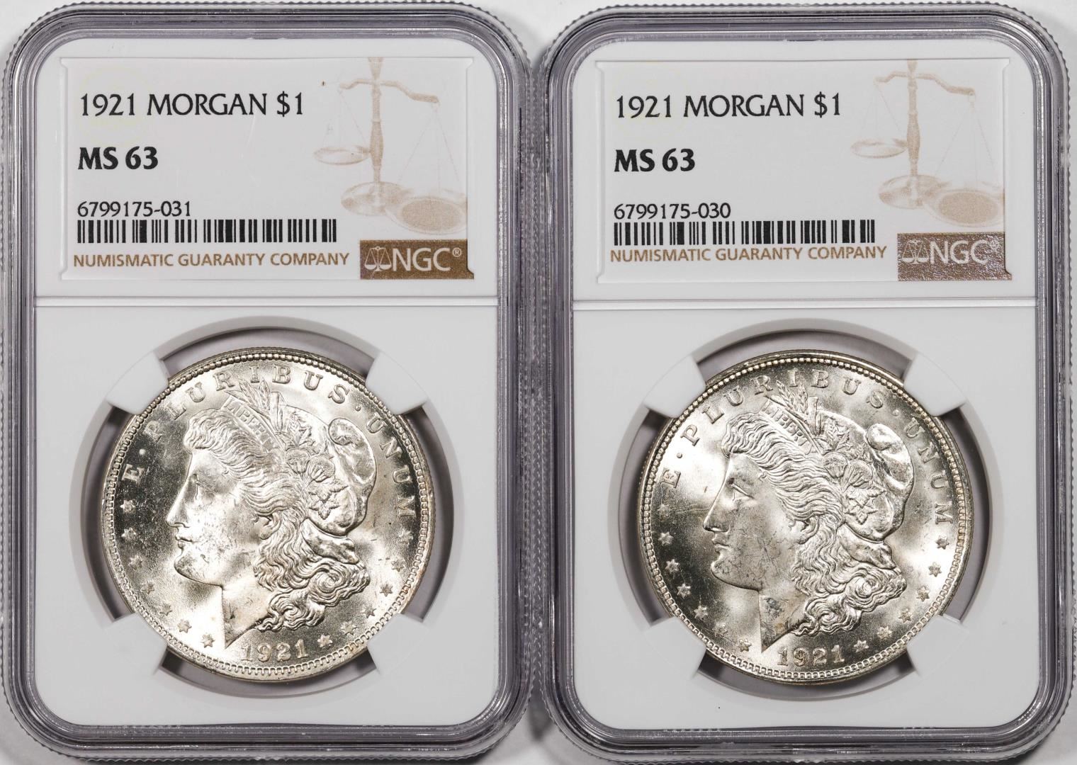 One Lot of (2) 1921 $1 Morgan Silver Dollar Coins NGC MS63. NGC Certified.