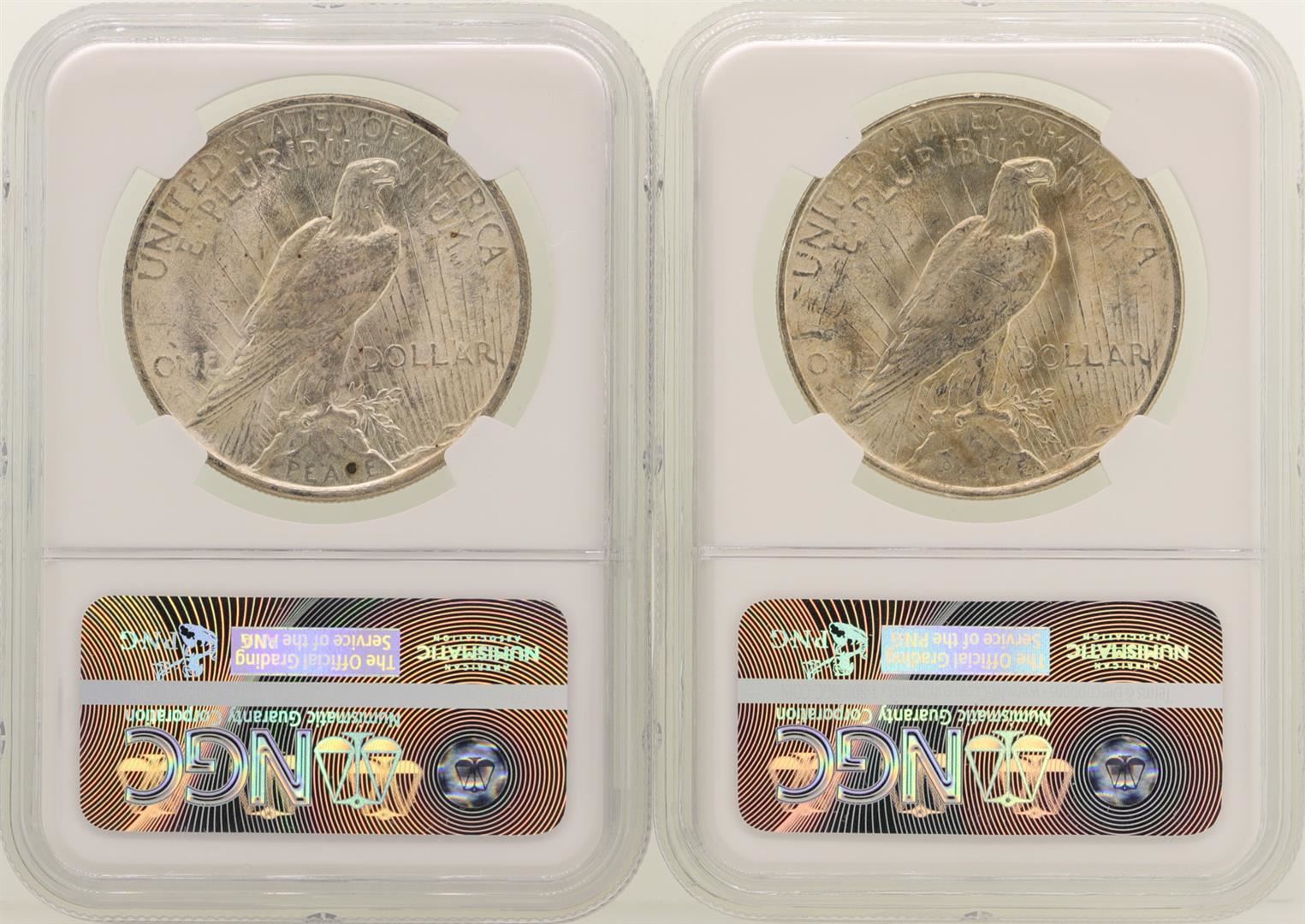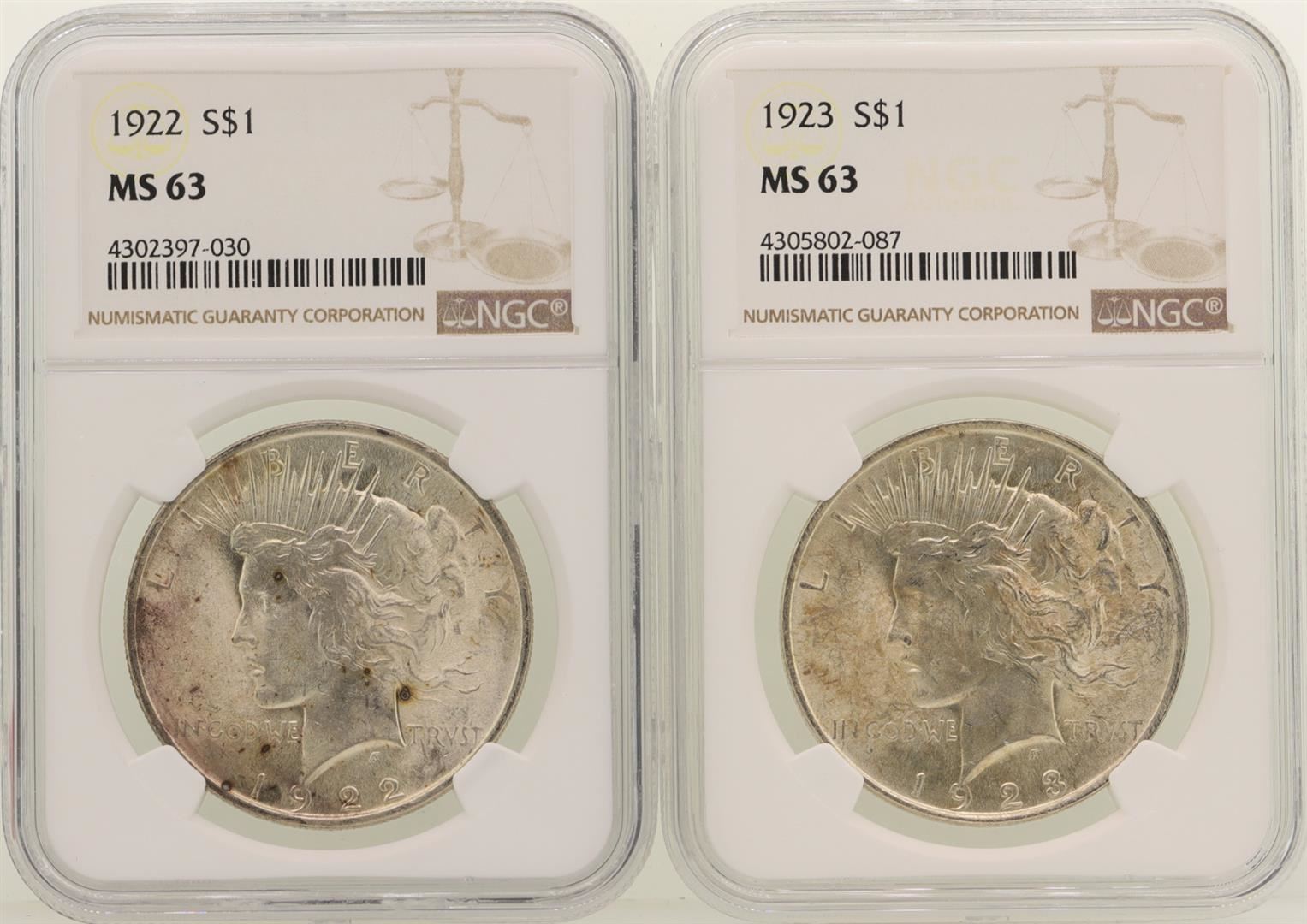 One Lot of (2) 1923 $1 Peace Silver Dollar Coins NGC MS63. NGC Certified.