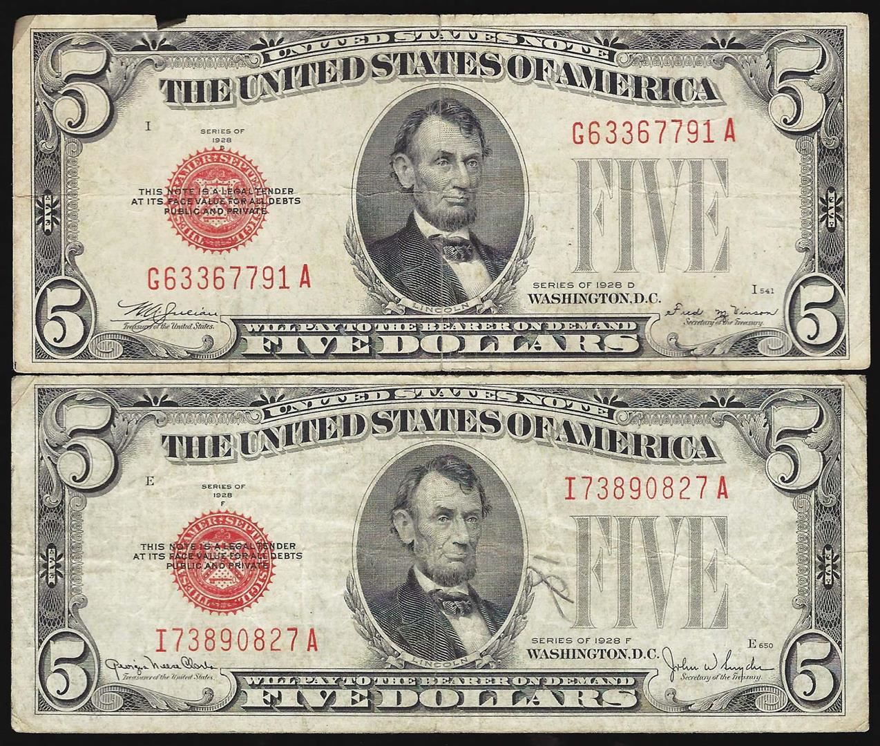 One Lot of (2) 1928 $5 Legal Tender Notes.