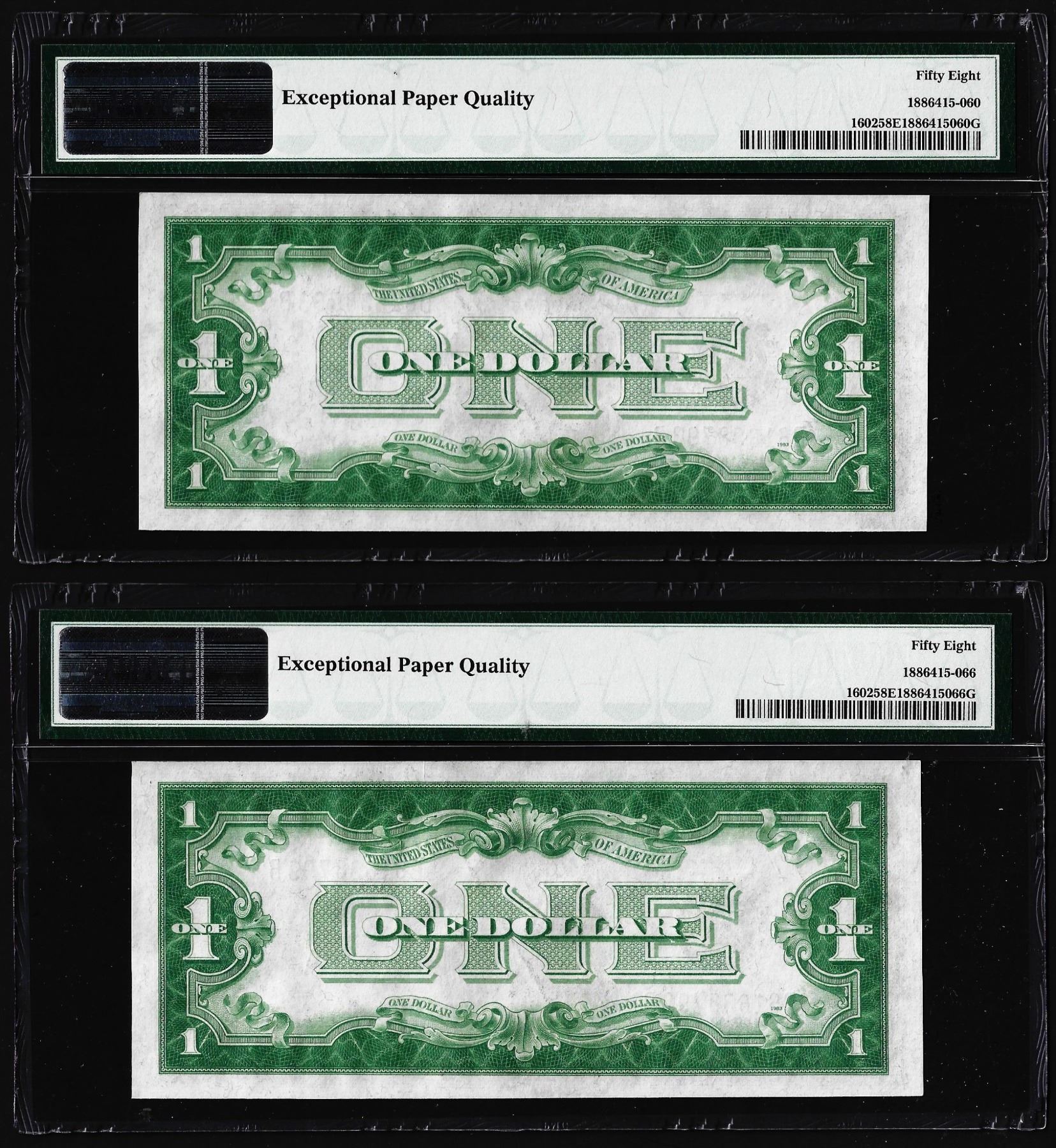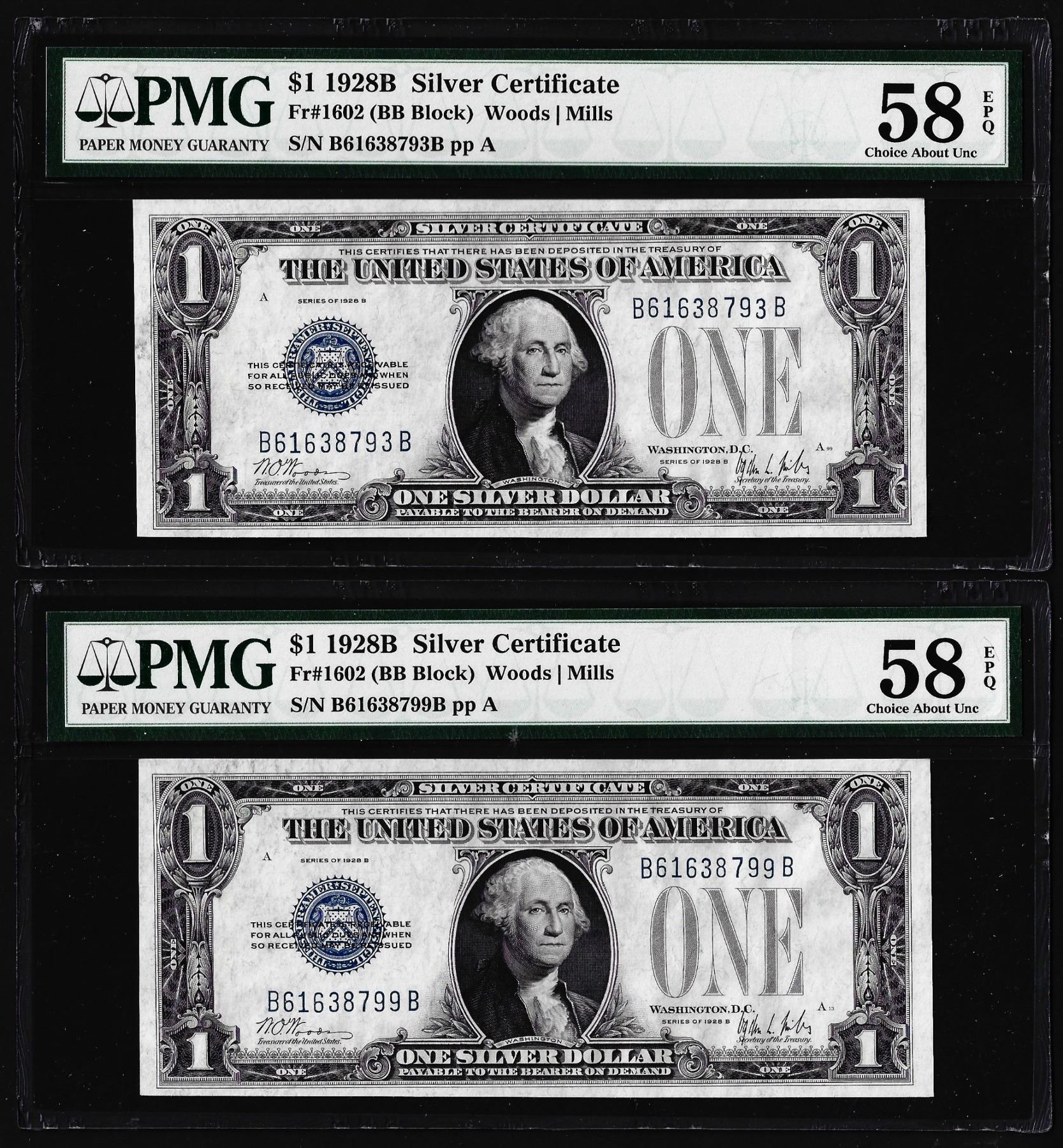 Lot of (2) 1928B $1 Silver Certificate Notes Fr.1602 PMG About Uncirculated 58EPQ